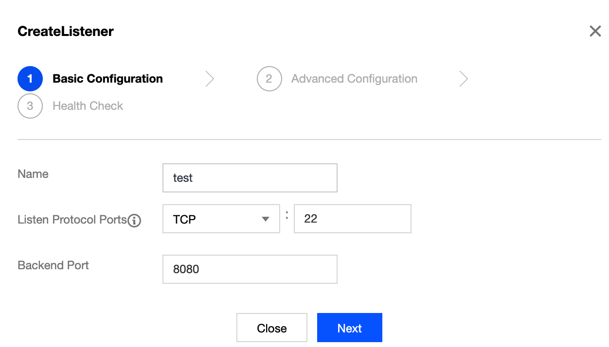 5. Na janela pop-up "Create Listener (Criar listener)", insira a "backend port (porta de back-end)" (para obter mais informações sobre a escolha da porta, consulte Portas comuns do servidor) e os outros campos relacionados e clique em Next (Avançar) para concluir a configuração. Para obter mais informações, consulte Configuração do CLB clássico. Nota: