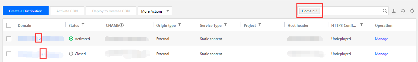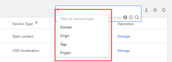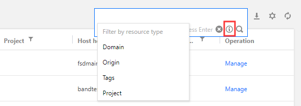 Atributo de nome de domínio único com várias palavras-chave | Atributo:palavra-chave|palavra-chave | Projeto:test1|test2 | ![]() | Filtra os nomes de domínio em que o nome de domínio contém "test1" ou "test2" do projeto selecionado. Atualmente, os atributos de nome de domínio e do servidor de origem não aceitam a pesquisa com várias palavras-chave |
