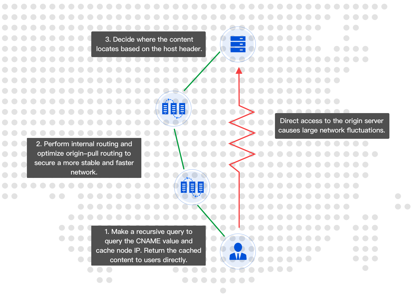 Aceleração dinâmica: O ECDN é adequado para cenários com muitas solicitações de recursos dinâmicos, como batalhas de jogos, transações de comércio eletrônico, transações financeiras e educação online. Ele pode selecionar a ligação ideal para pull de origem usando várias tecnologias, como detecção de rota dinâmica e roteamento inteligente, reduzindo bastante a latência de acesso.