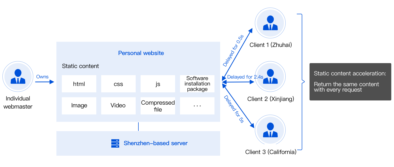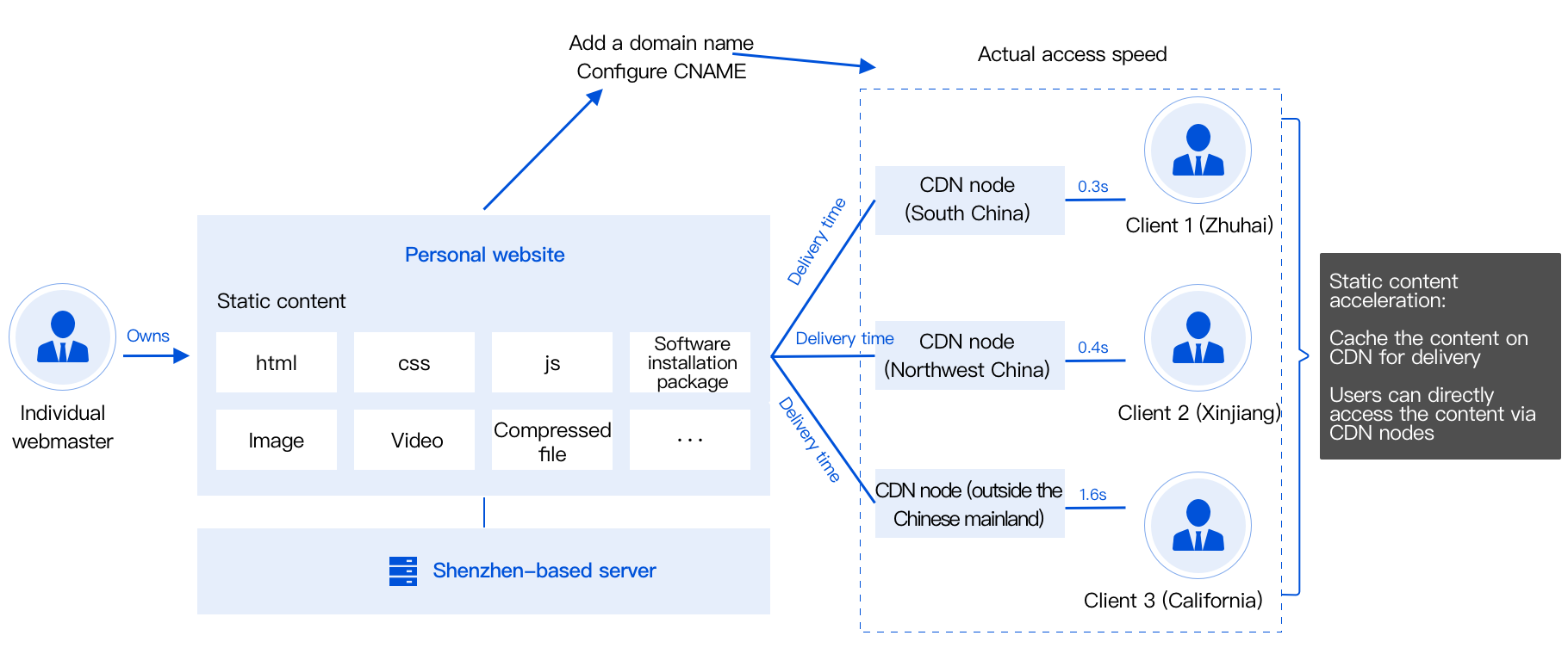 Depois que o CDN armazena o conteúdo em cache, os usuários finais precisam apenas acessar os nós do CDN próximos para obter o conteúdo estático.