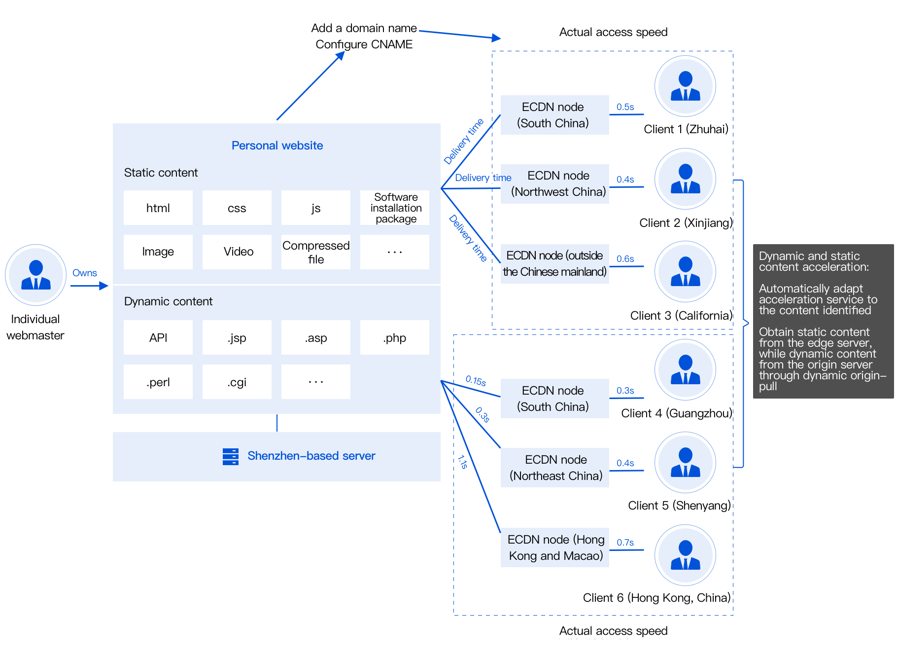 Aceleração Dinâmica/Estática: O ECDN é aplicável a cenários com recursos dinâmicos e estáticos. Ele pode sustentar melhor esses cenários reconhecendo automaticamente os recursos dinâmicos, usando diferentes políticas de aceleração e implementando aceleração única para recursos dinâmicos e estáticos. Como a conexão ECDN é usada, os padrões de cobrança do ECDN devem prevalecer para recursos estáticos e dinâmicos.