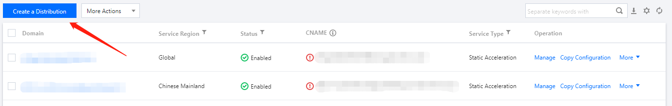 Nome de domínio de aceleração | Nome de domínio a ser conectado ao CDN, que é o nome de domínio real acessado pelos usuários finais | Create a Domain Name (Criar um nome de domínio) > Domain Configuration (Configuração de domínio) |
