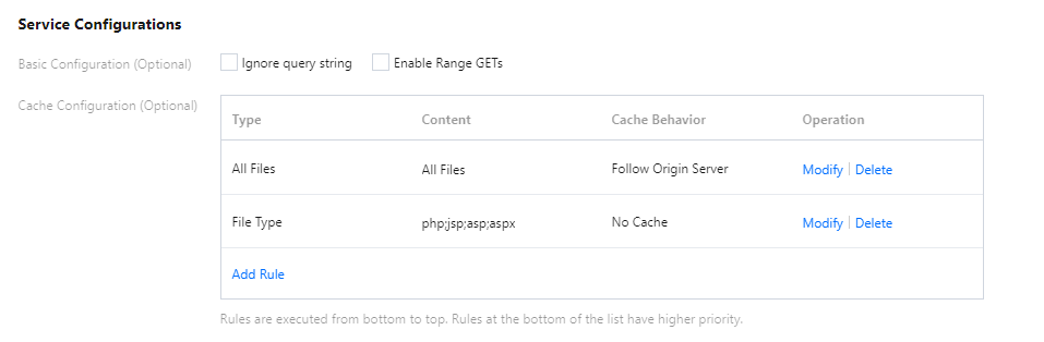 Protocolo de pull de origem | Essa opção pode ser selecionada com base nos protocolos aceitos pelo servidor de origem: HTTP: as solicitações de acesso HTTP/HTTPS usam pull de origem HTTP. HTTPS: as solicitações de acesso HTTP/HTTPS usam pull de origem HTTPS (o servidor de origem deve ser compatível com o acesso HTTPS). Seguir o protocolo: As solicitações de acesso HTTP usam pull de origem HTTP, já as solicitações de acesso HTTPS usam pull de origem HTTPS (o servidor de origem deve ser compatível com o acesso HTTPS). |