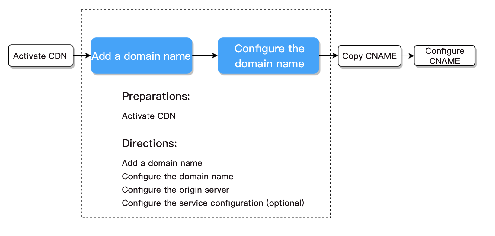 Nome de domínio CNAME | Depois que seu nome de domínio de aceleração estiver conectado, o sistema atribuirá automaticamente um nome de domínio CNAME com o sufixo .cdn.dnsv1.com ou .dsa.dnsv1.com. Depois que seus nomes de domínio de aceleração forem mapeados para o nome de domínio CNAME, o Tencent Cloud alterará dinamicamente o endereço IP apontado pelo registro CNAME e atualizará todos os seus nomes de domínio de aceleração, eliminando a necessidade de alterar manualmente os endereços IP apontados para eles. | Configure CNAME (Configuração do CNAME) |