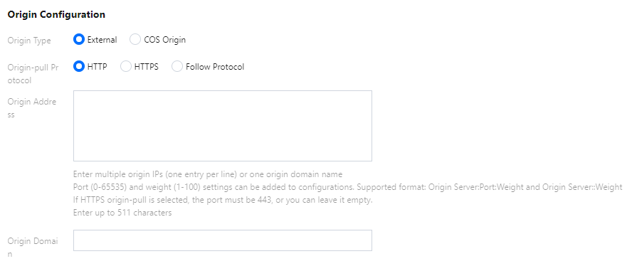 Endereço do servidor de origem | Origem do cliente: 1. Vários IPs podem ser configurados como o servidor de origem e essa sondagem será feita durante o pull de origem. 2. É possível configurar a porta (0 a 65535) e o peso (1 a 100) no formato de origin server:port:weight. A porta pode ser omitida e o formato torna-se origin server::weight. Observação: Atualmente, o protocolo HTTPS aceita apenas a porta 443. 3. É possível configurar um nome de domínio como o servidor de origem e ele deve deve ser diferente do nome de domínio de aceleração CDN. Observação: usar um nome de domínio de aceleração de CDN conectado como o servidor de origem causará um loop de resolução e uma falha de pull de origem. Tencent Cloud COS: 1. É possível selecionar um bucket do COS Tencent como o servidor de origem. 2. Defina o tipo de servidor de origem para o nome de domínio padrão ou site estático de acordo com a configuração do bucket e seu caso de uso real. 3. Para um bucket privado, conceda acesso CDN ao bucket. Armazenamento de objetos de terceiros: 1. Se o recurso estiver armazenado em uma plataforma de armazenamento de objetos de terceiros, insira um endereço de acesso válido ao bucket como o servidor de origem. Atualmente, o AWS S3 e o Alibaba Cloud OSS são compatíveis. Obervação: http:// e http:// não podem ser incluídos. my-bucket.oss-cn-beijing.aliyuncs.com e my-bucket.s3.ap-east-1.amazonaws.com são compatíveis. 2. Para um bucket privado de terceiros, insira a chave válida e ative a autenticação de encaminhamento para acessar o bucket. |