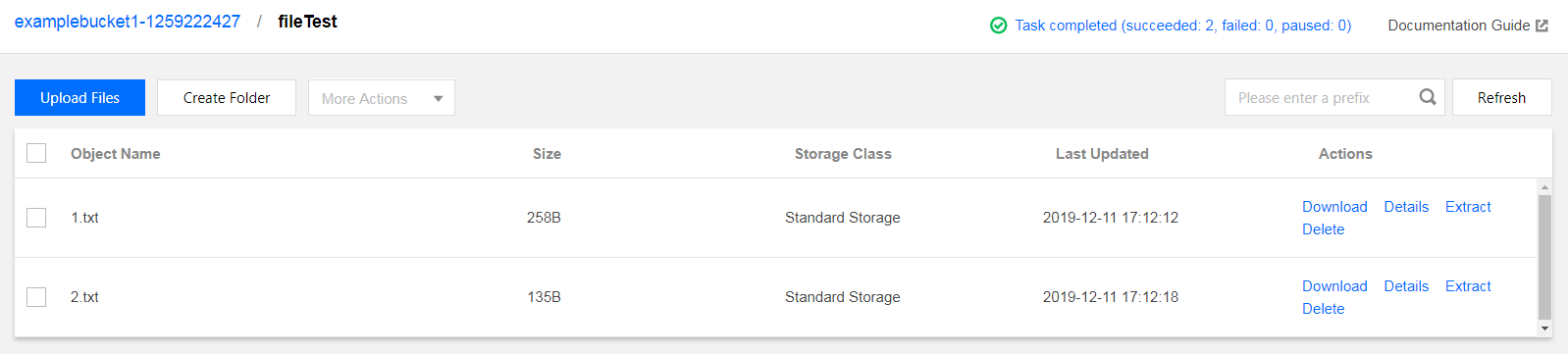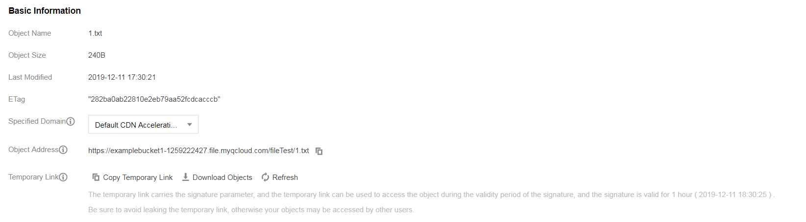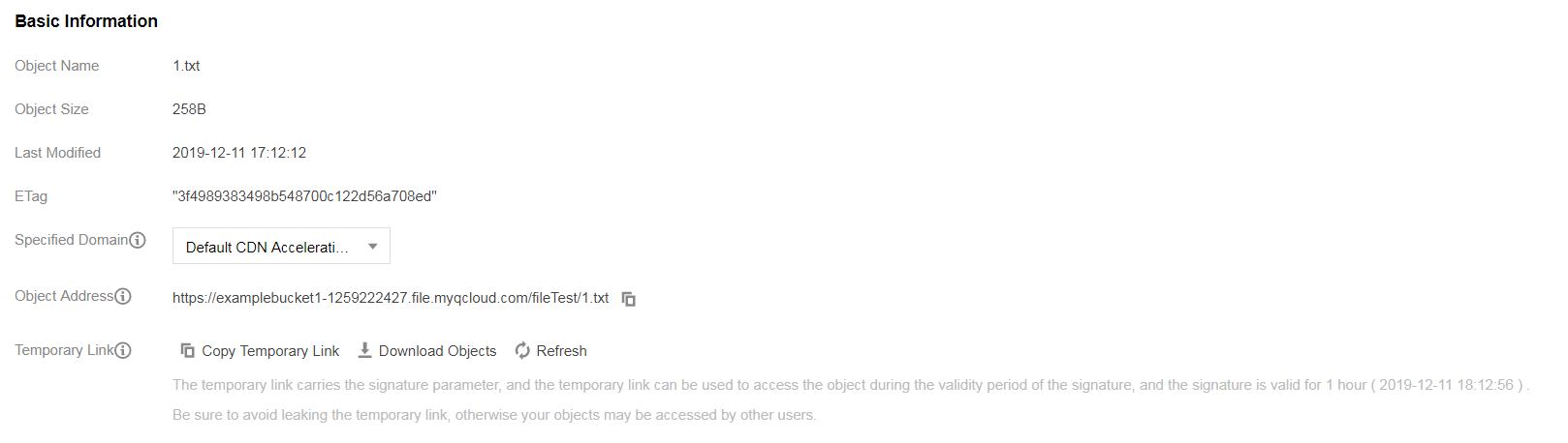 O nome do domínio de aceleração é purge-test-1251991073.file.myqcloud.com, o servidor de origem é o Tencent Cloud Object Storage (COS) e os recursos no servidor de origem são os seguintes: