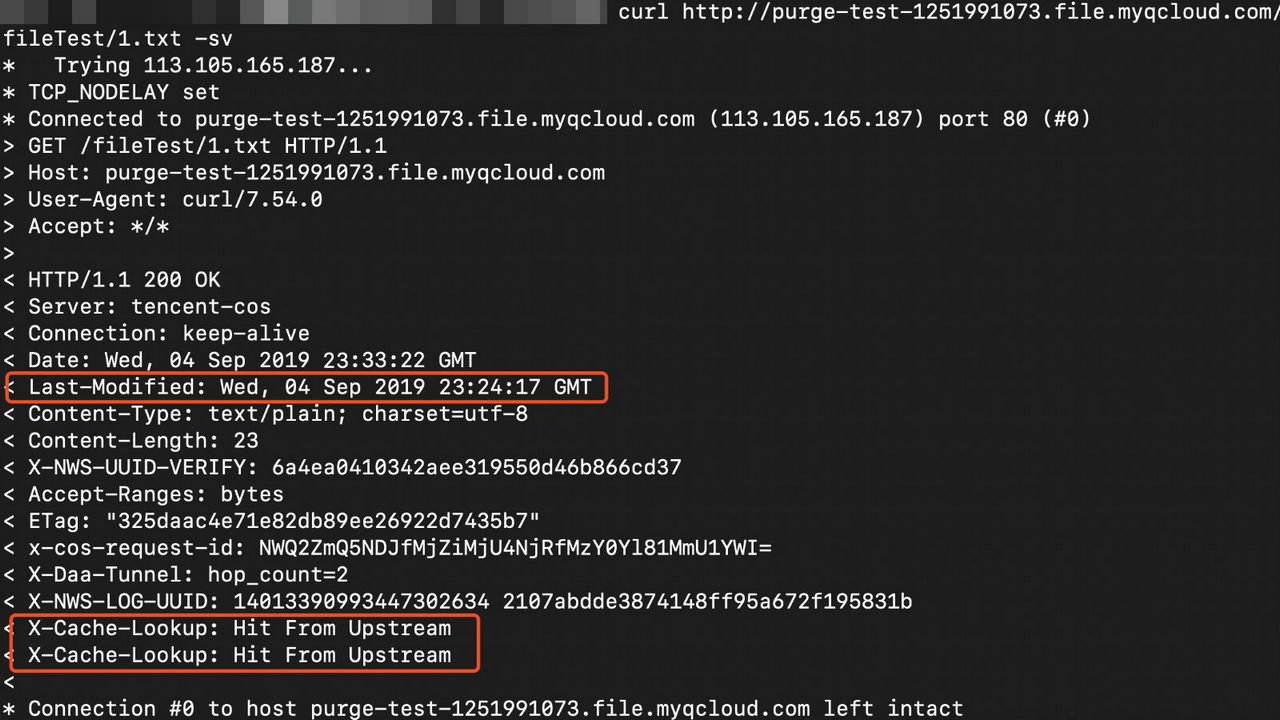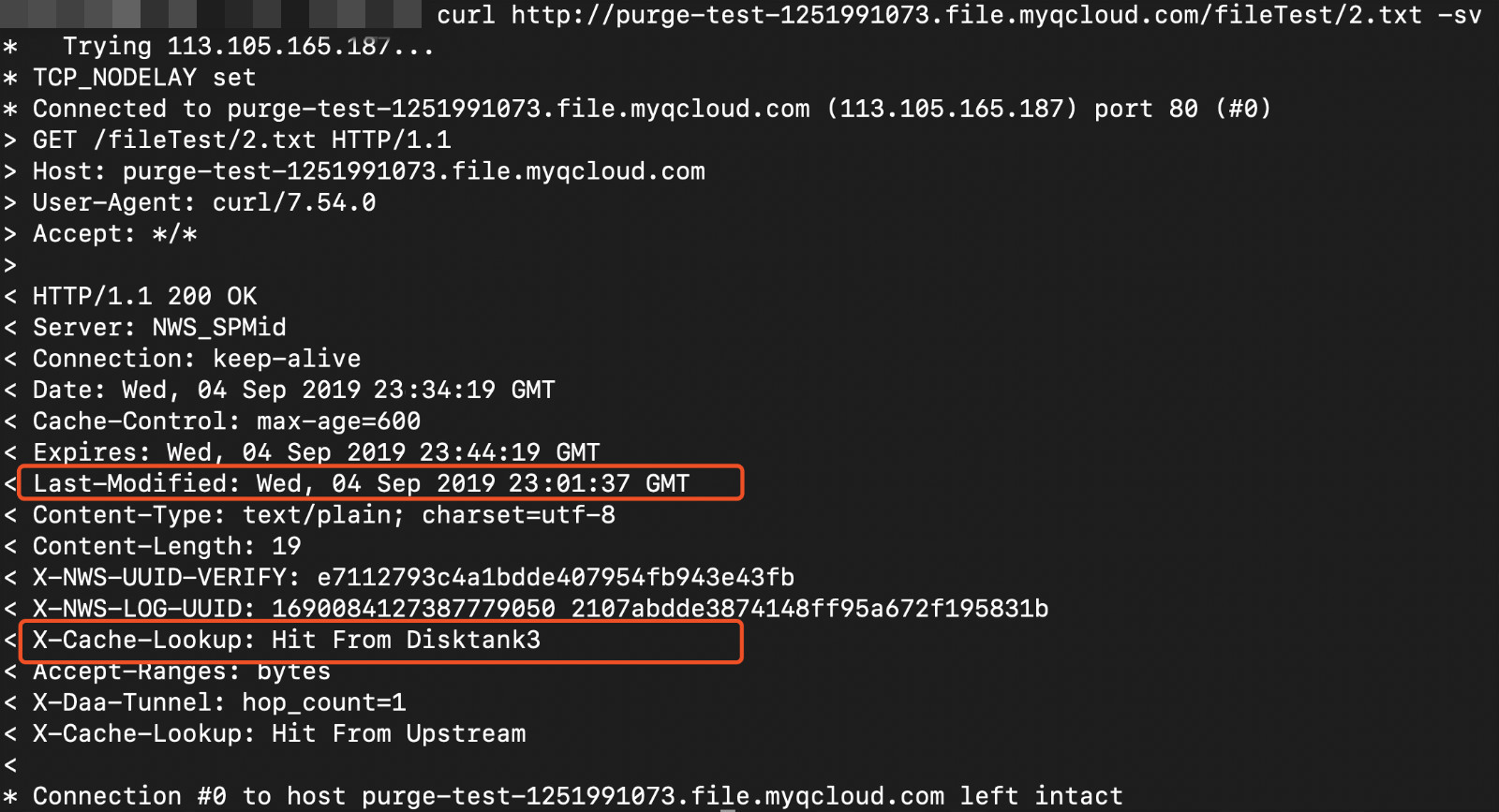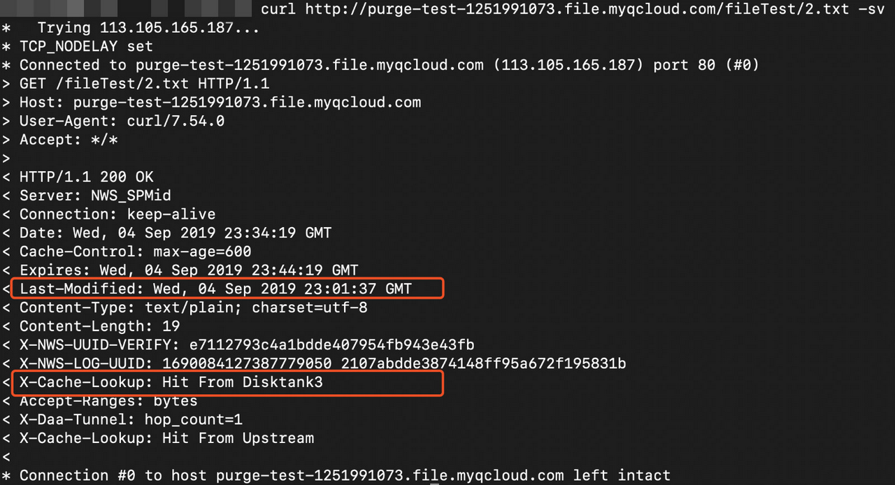 5. Após a limpeza ser concluída, devido ao Last-Modified de 1.txt ser alterado, a solicitação será encaminhada ao servidor de origem. Como 2.txt não foi alterado, mesmo após o envio de uma tarefa de limpeza de diretório, ele ainda será atingido e retornado: