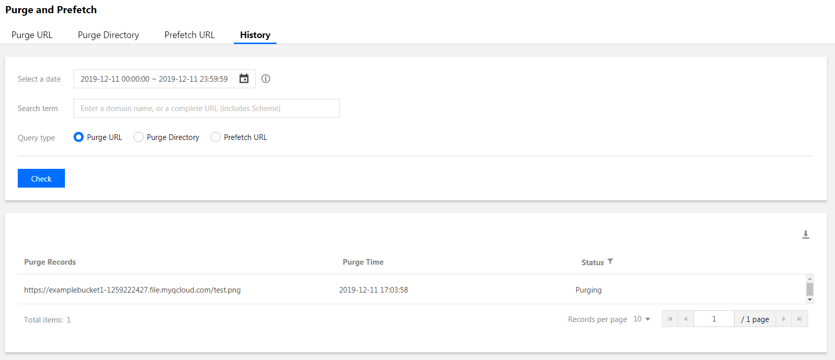 Faça login no Console do CDN, clique em Purge and Prefetch (Limpeza e pré-busca) na barra lateral esquerda e envie uma tarefa Purge URL (Limpeza de URL) ou Purge Directory (Limpeza de diretório). Você pode limpar URLs/diretórios do CDN e do ECDN juntos.