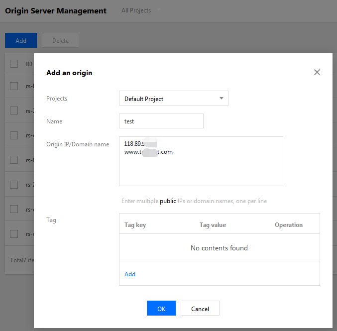 Faça login no Console do GAAP. Na página “Origin Server Management (Gerenciamento de servidores de origem)”, clique em Add (Adicionar) para adicionar informações sobre todos os servidores que precisam de aceleração de acesso. Você pode inserir o IP ou nome de domínio do servidor de origem e separar vários servidores de origem com a tecla Enter. O IP do servidor de origem aceita endereços IPv4 e IPv6.