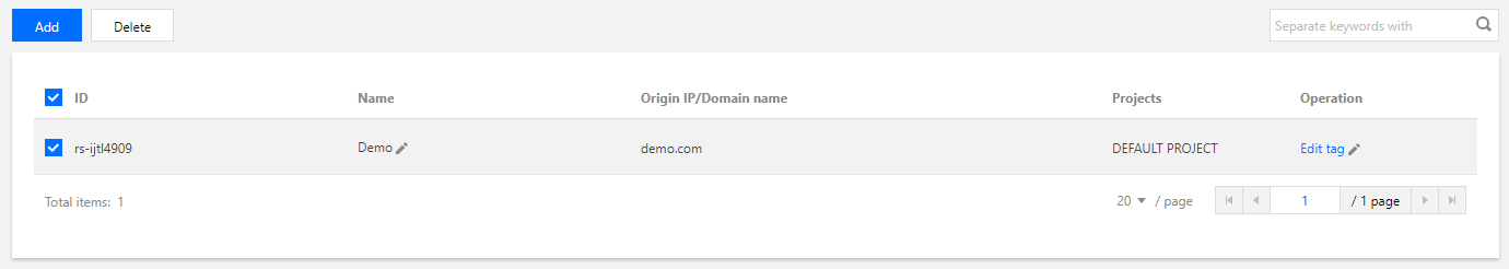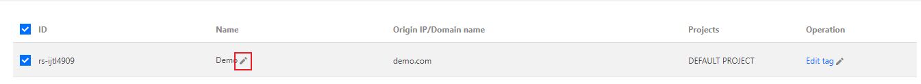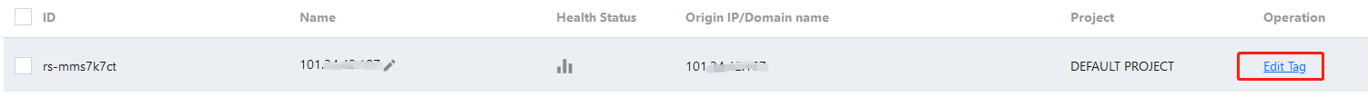 1. Faça login no Console do GAAP. Na página Origin Server Management (Gerenciamento de servidores de origem), clique em Edit Tag (Editar tag) à direita do servidor de origem.