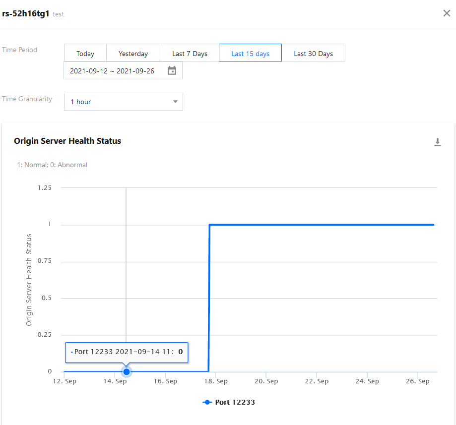 2. Na janela pop-up no canto superior direito, você pode exibir o status de integridade do servidor de origem durante diferentes períodos e granularidades. 1 indica que o servidor de origem está normal e 0 significa que está anormal.