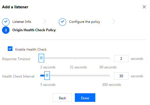 O Health Check Interval (Intervalo de verificações de integridade) se refere ao intervalo entre duas verificações de integridade consecutivas. Se a verificação de integridade determinar que um servidor de origem está anormal, ele parará de encaminhar pacotes até que retorne a um status normal após outra verificação.