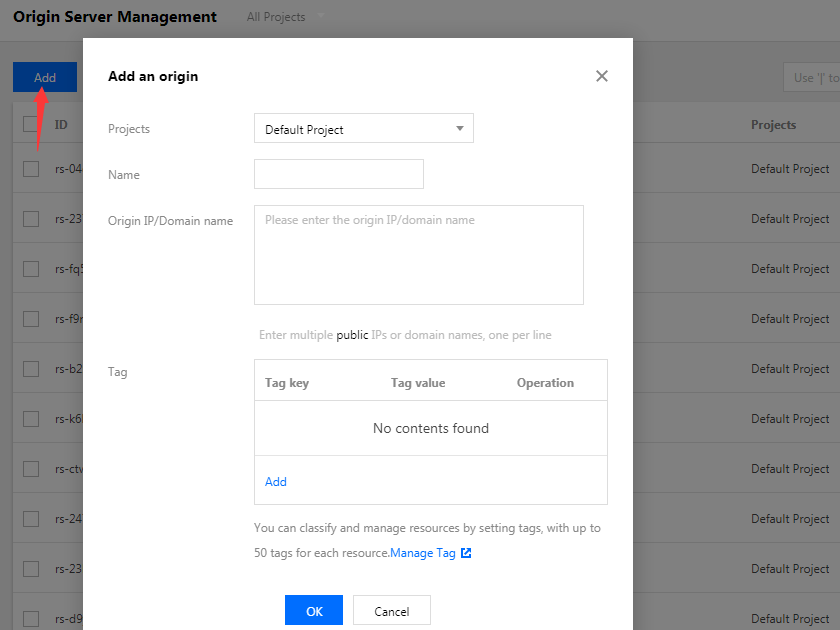 2. Clique em Origin Server Management (Gerenciamento de servidores de origem) > Create (Criar), defina o nome, insira o IP ou nome de domínio do servidor de origem e adicione tags (opcional) para acrescentar as informações de todos os servidores para os quais acelerar o acesso a Origin Server Management (Gerenciamento de servidores de origem). É possível inserir as informações de vários servidores de origem ao mesmo tempo.