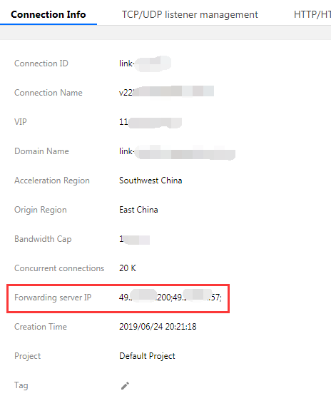 Se uma regra de grupo de segurança for definida para o servidor de origem, primeiro é necessário clicar no ID/Connection Name (ID/Nome da conexão), consultar o Forwarding Server IP (IP do servidor de encaminhamento) na guia Connection Information (Informações de conexão) e permitir o acesso ao servidor de origem por esses IPs, para implementar a aceleração conforme mostrado abaixo:
