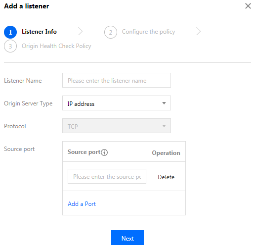 2. Configure as informações do listener (com TCP como exemplo) para definir o mapeamento entre o protocolo de aceleração e a porta de escuta. É possível mapear várias portas de escuta de uma vez, mas elas devem ser exclusivas.