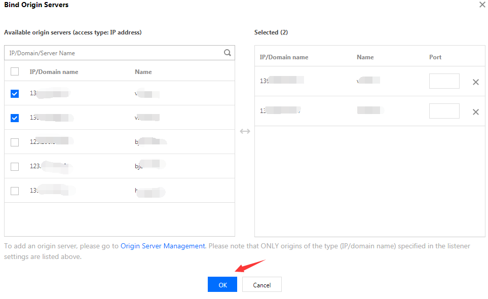 2. Adicione todos os servidores de origem a serem vinculados na lista à esquerda para a caixa à direita e, depois, insira o número da porta do servidor de origem.