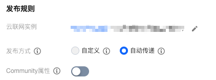 发布方式系统自动填充,默认自定义方式,如果需要自动传递方式请提交 工单申请。 在网段详情页面的自定义页签中单击新建,并填写发往云联网的网关信息,然后单击保存。