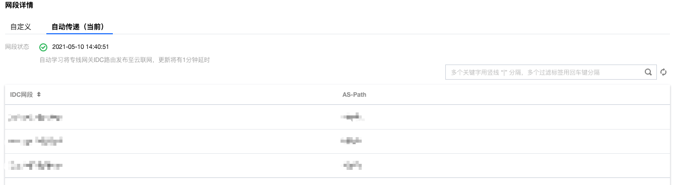 在自动传递方式下专线网关自动学习 IDC 网段信息,无须配置。
