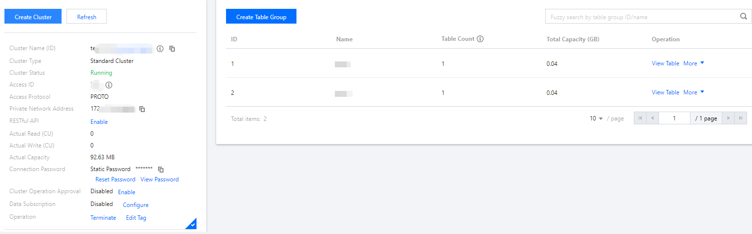 3. 购买完成后,返回集群列表可查看创建完的集群和表格组,系统会为每个集群分配一个唯一的集群 ID。