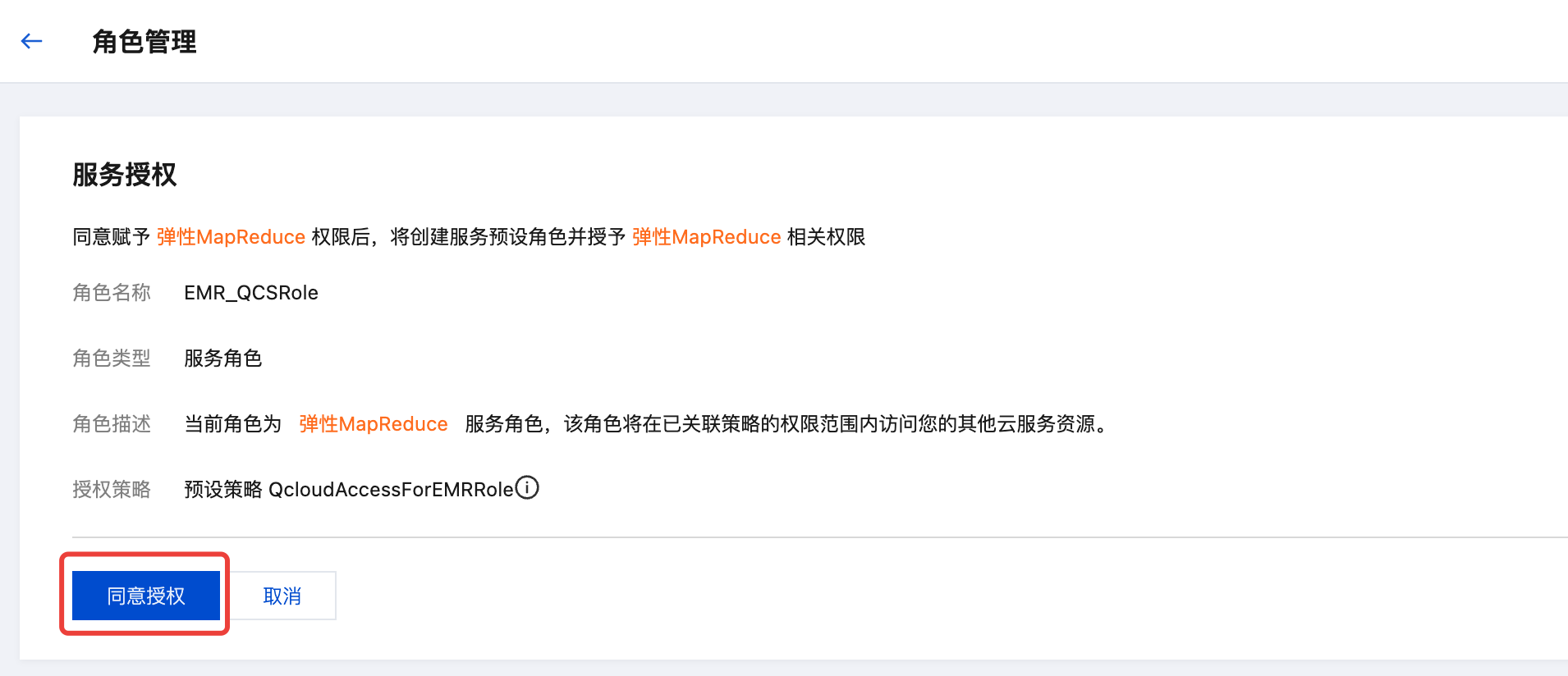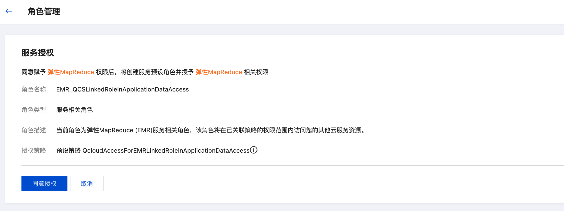 2. 单击同意授权,会自动创建服务角色 EMR_QCSRole 并关联相关策略。
