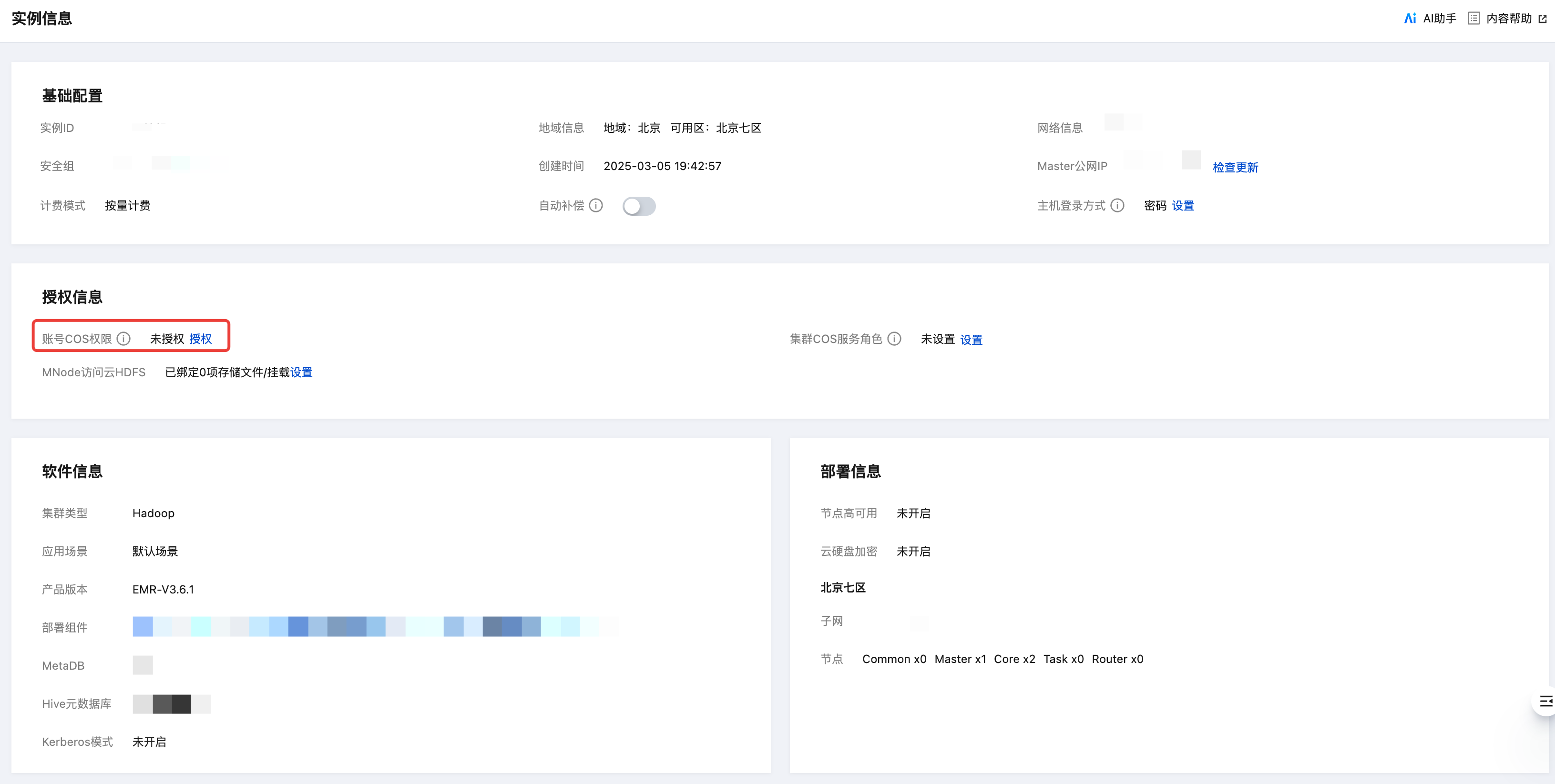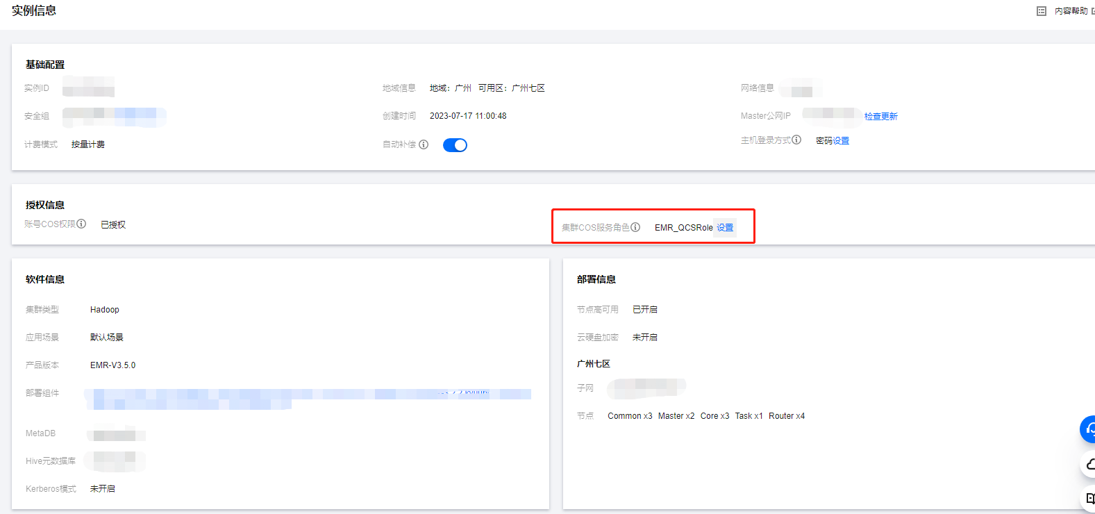 3. 当服务相关角色和服务角色均已授权时,默认使用服务相关角色,集群实例信息授权策略中,对象存储显示已授权,且集群 COS 服务角色会显示 EMR_QCSLinkedRoleInApplicationDataAccess 角色。