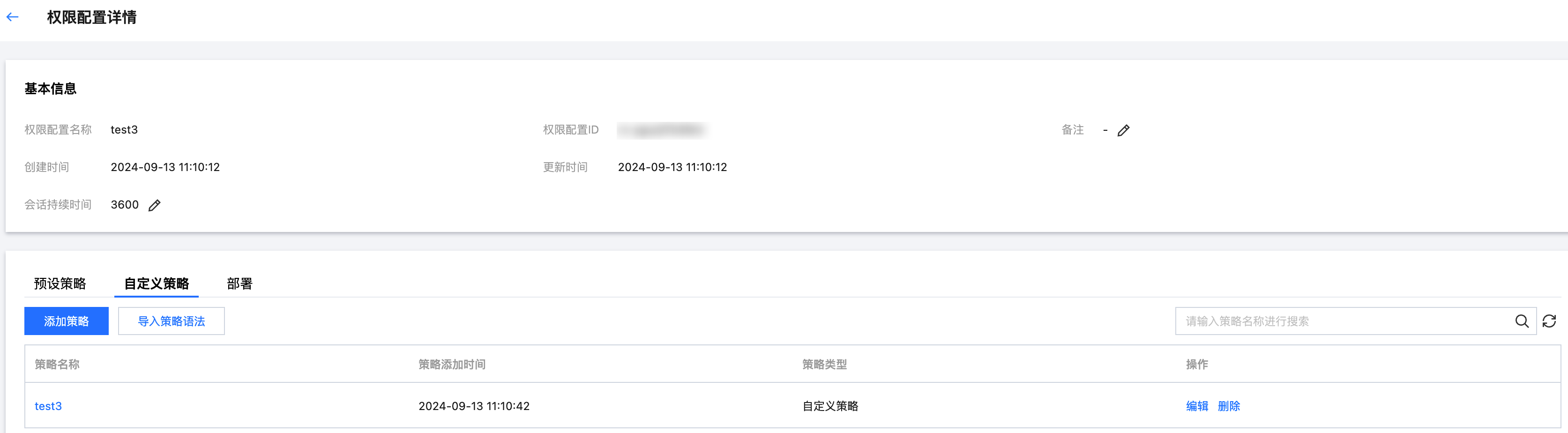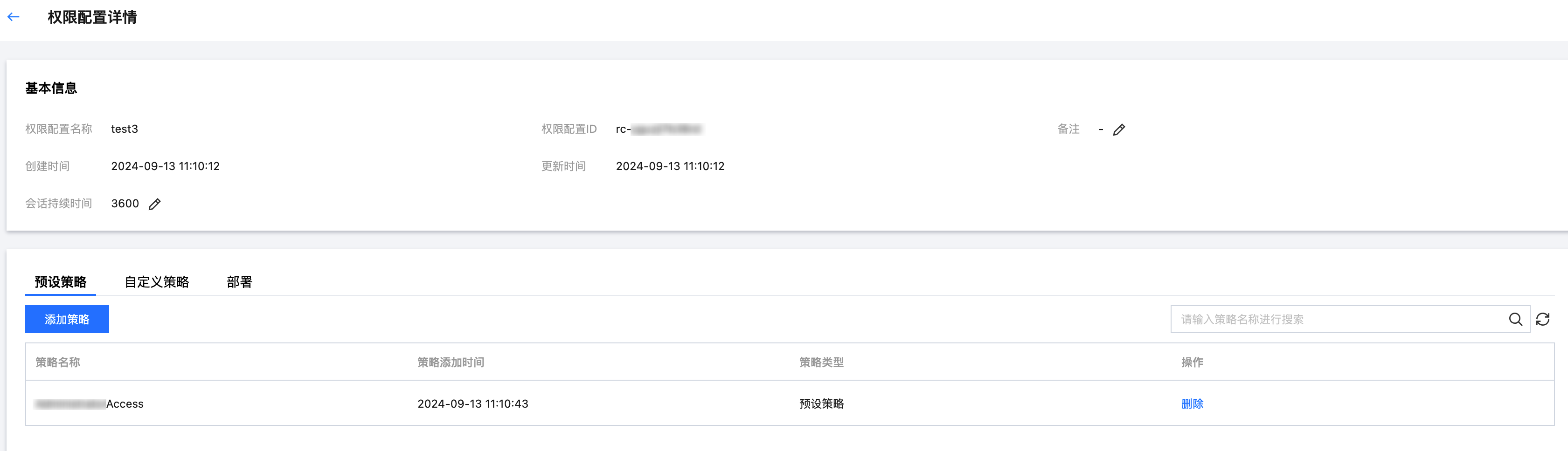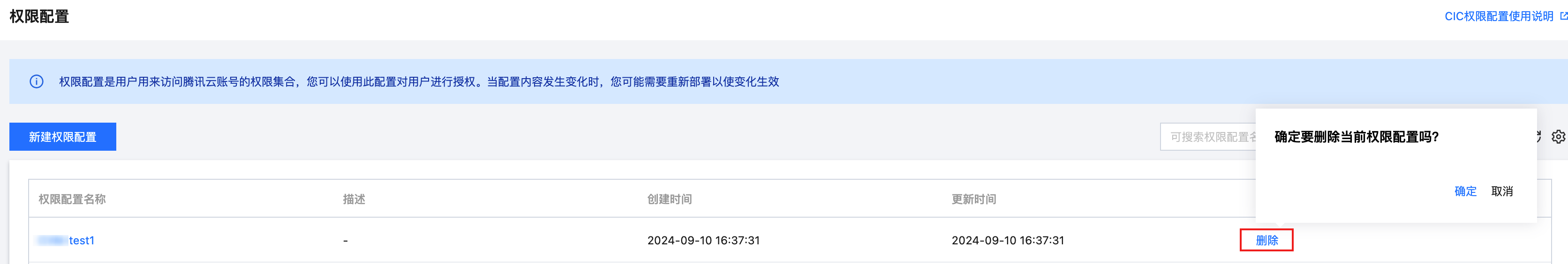 3. 在权限配置页面,单击目标权限配置操作列的删除。