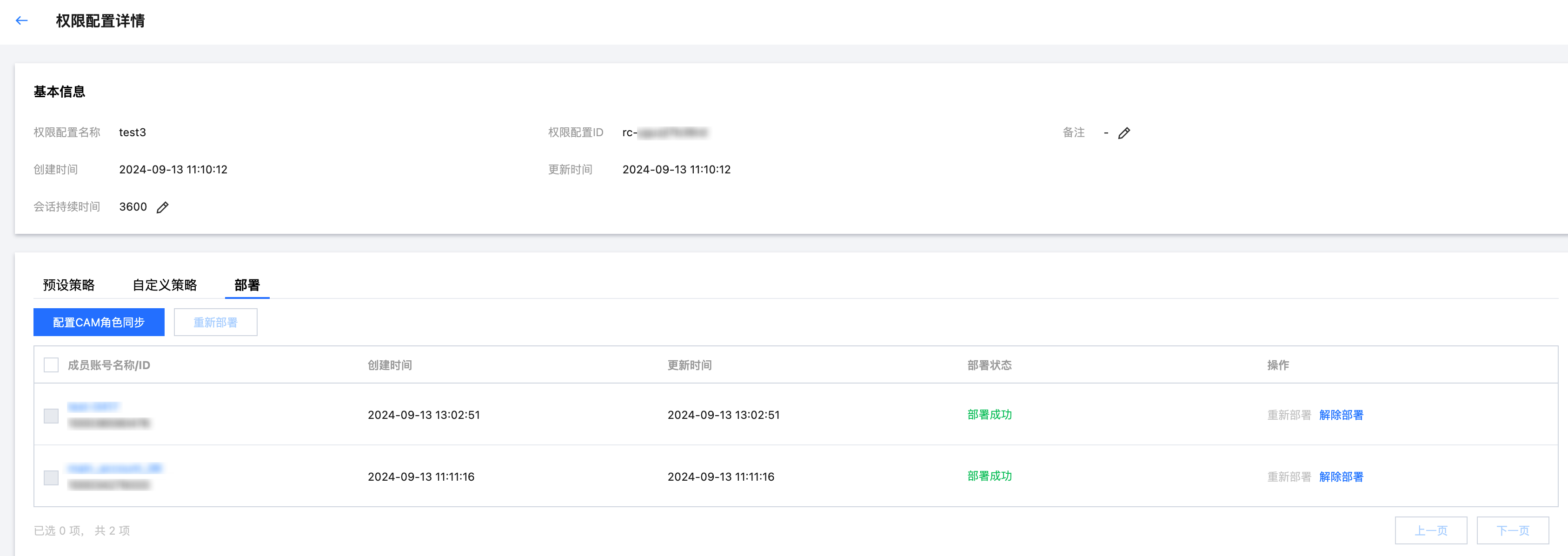 7. 单击部署页签,查看该权限配置已部署的成员账号。