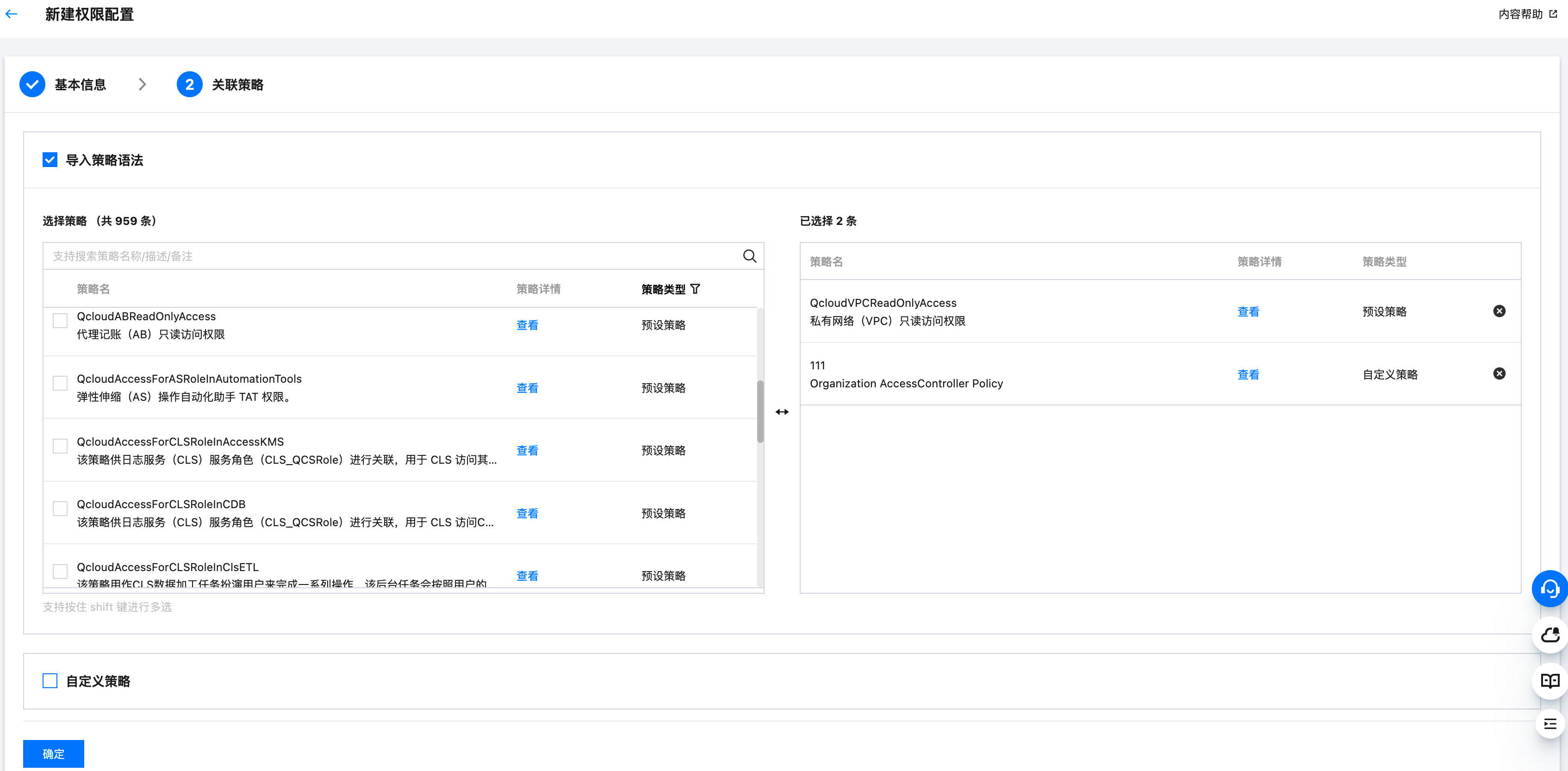 5. 配置关联策略,可以选择导入已有预设策略和自定义策略。