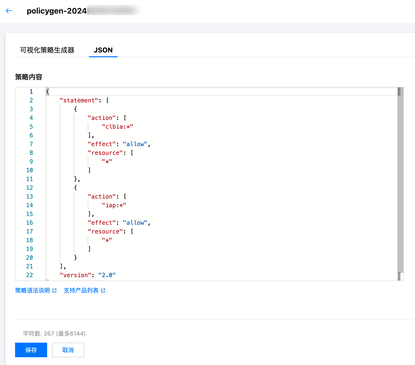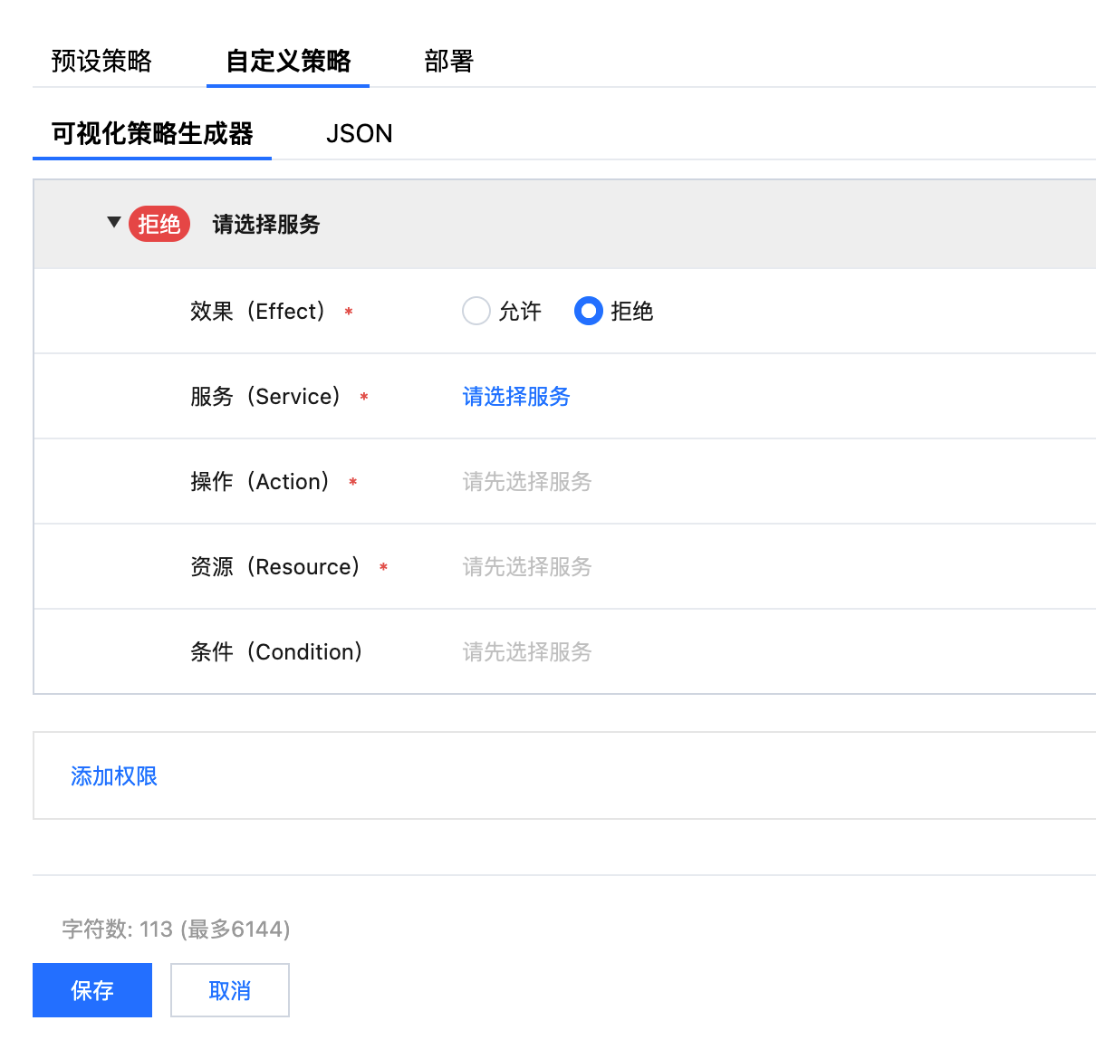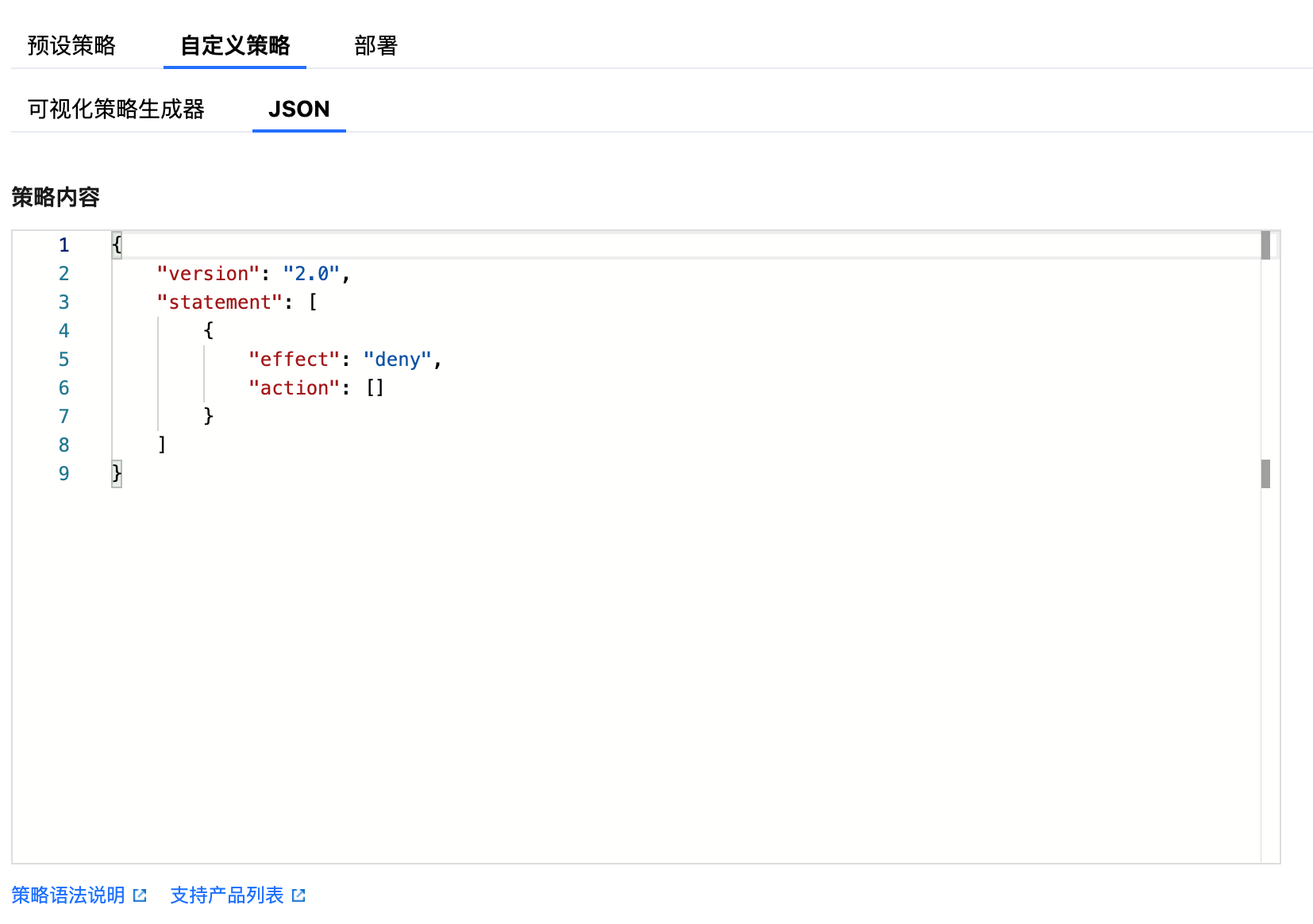 1. 单击添加策略。自定义策略复用 CAM 的策略语法,语法逻辑,请参见 语法结构。 2. 添加好后,单击保存。