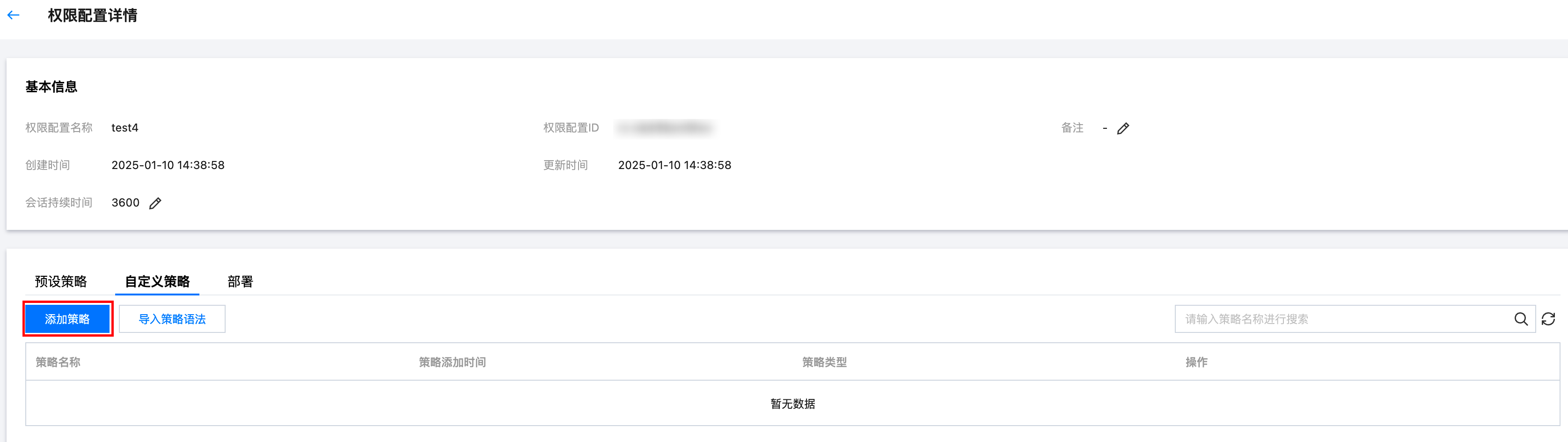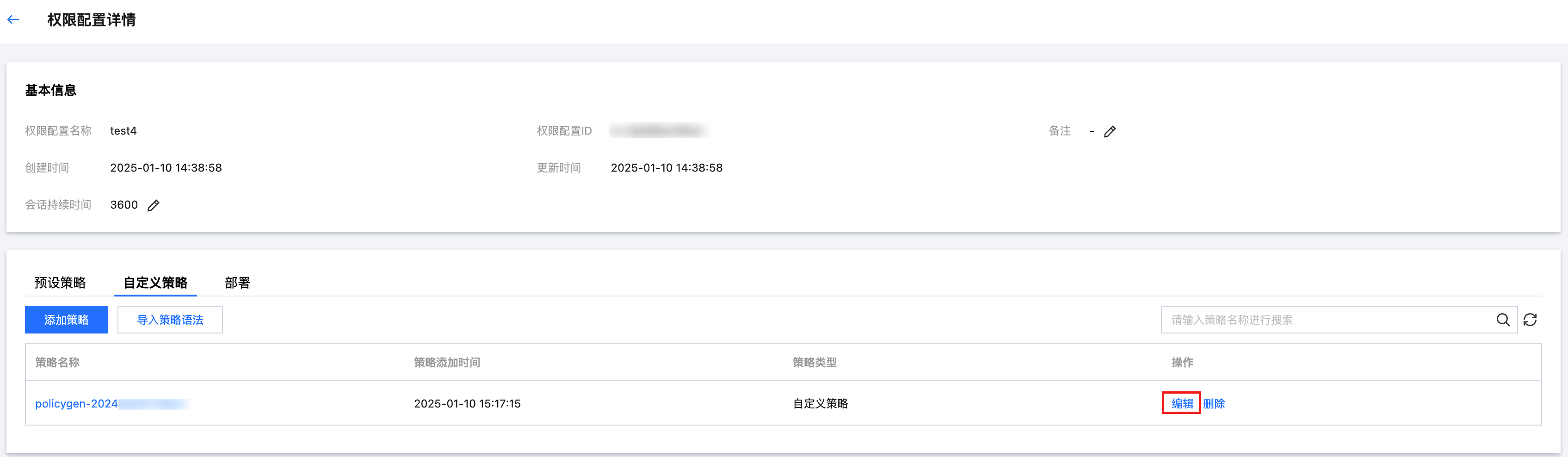 添加、修改或删除自定义策略后,如果权限配置已经被部署在成员账号中,您需要重新部署访问配置,才能在成员账号中生效。具体操作,请参见 重新部署权限配置。 添加自定义策略