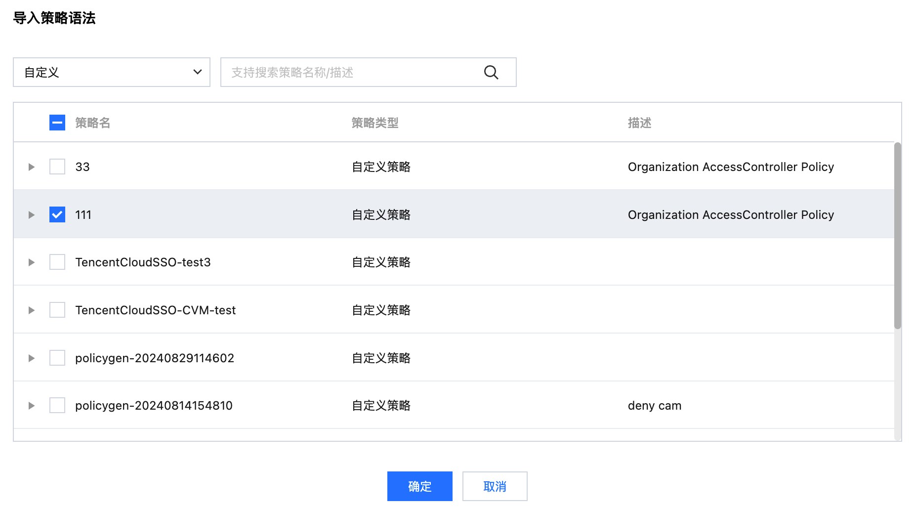2. 勾选 CAM 中已有的自定义策略,单击确定。