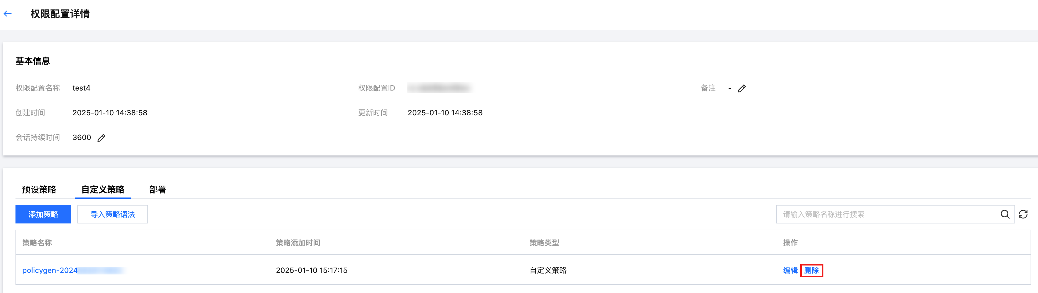 4. 在权限配置详情页面,单击操作列的删除按钮,在弹出的对话框,单击确定。