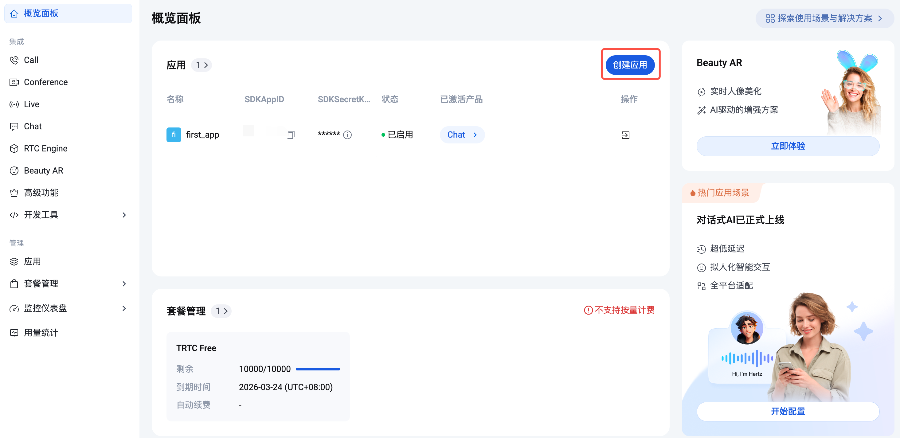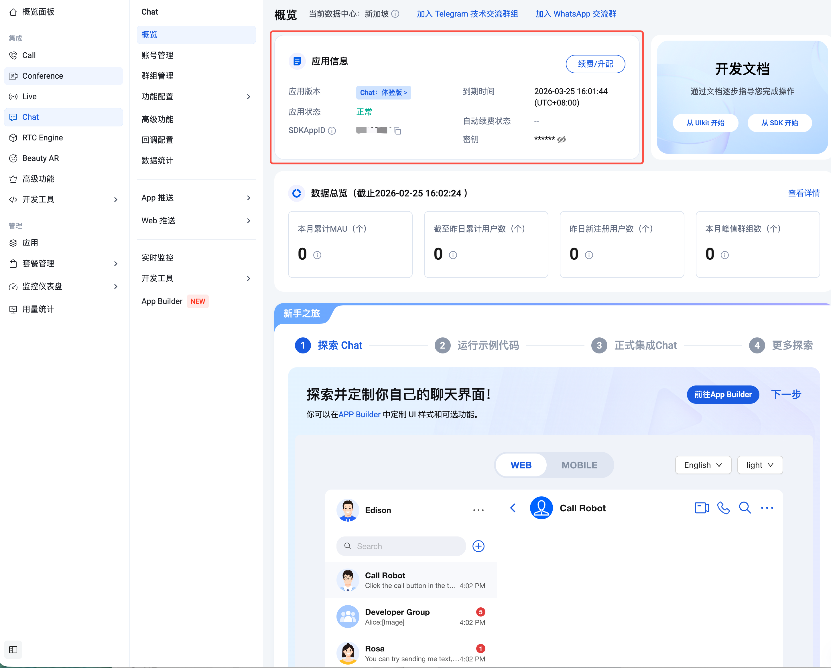 4. 创建完成后,可在当前 Chat 产品详情页面 查看新建应用的状态、业务版本、SDKAppID、SDKSecretKey、创建时间以及到期时间。 说明