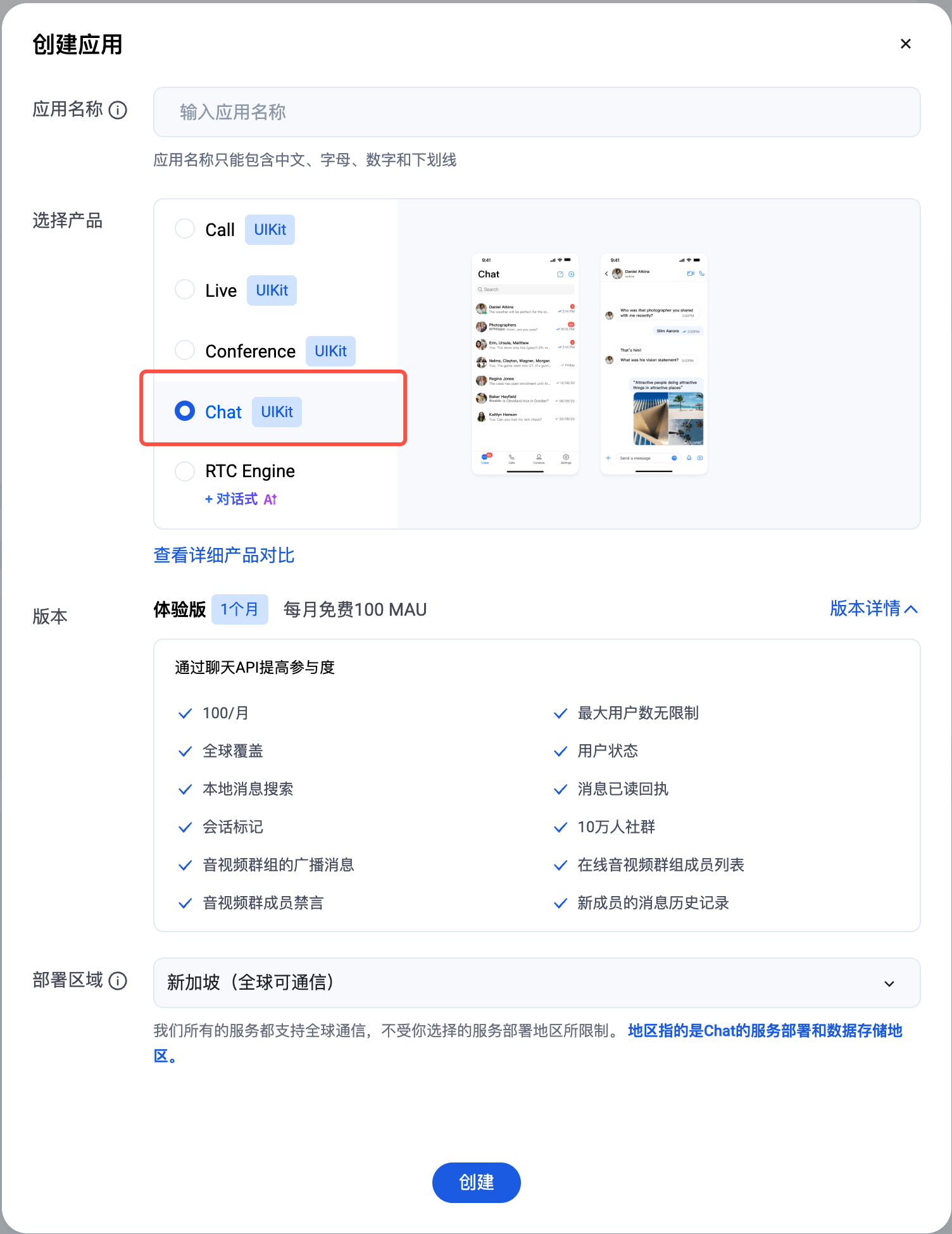 3. 在创建弹窗中输入应用名称,选择 Chat,选择合适的 区域,单击 创建。
