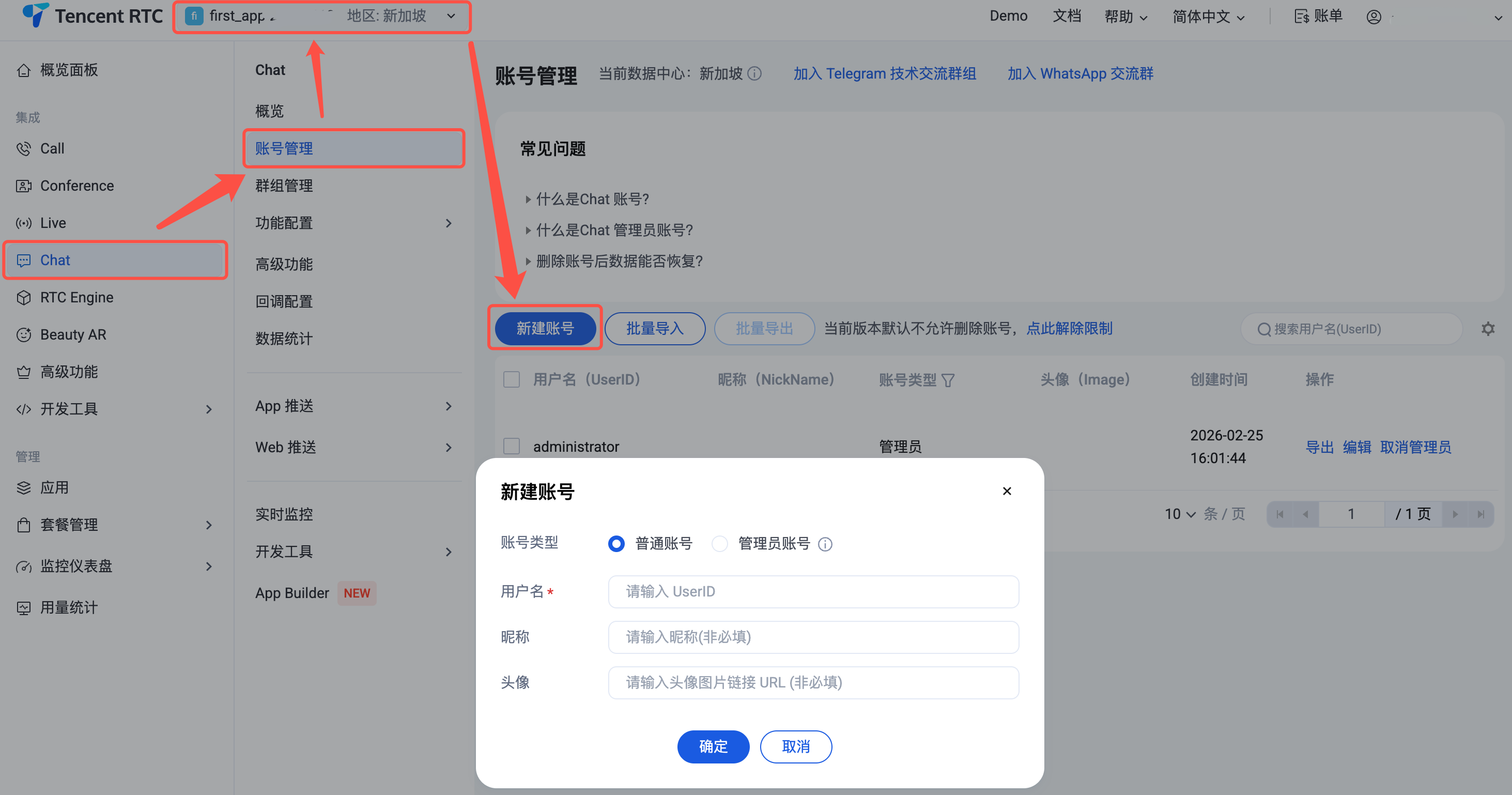 同一个腾讯云账号,最多可创建300个即时通信 Chat 应用。若已有300个应用,您可以先 停用并删除 无需使用的应用后再创建新的应用。应用删除后,该 SDKAppID 对应的所有数据和服务不可恢复,请谨慎操作。 创建账号