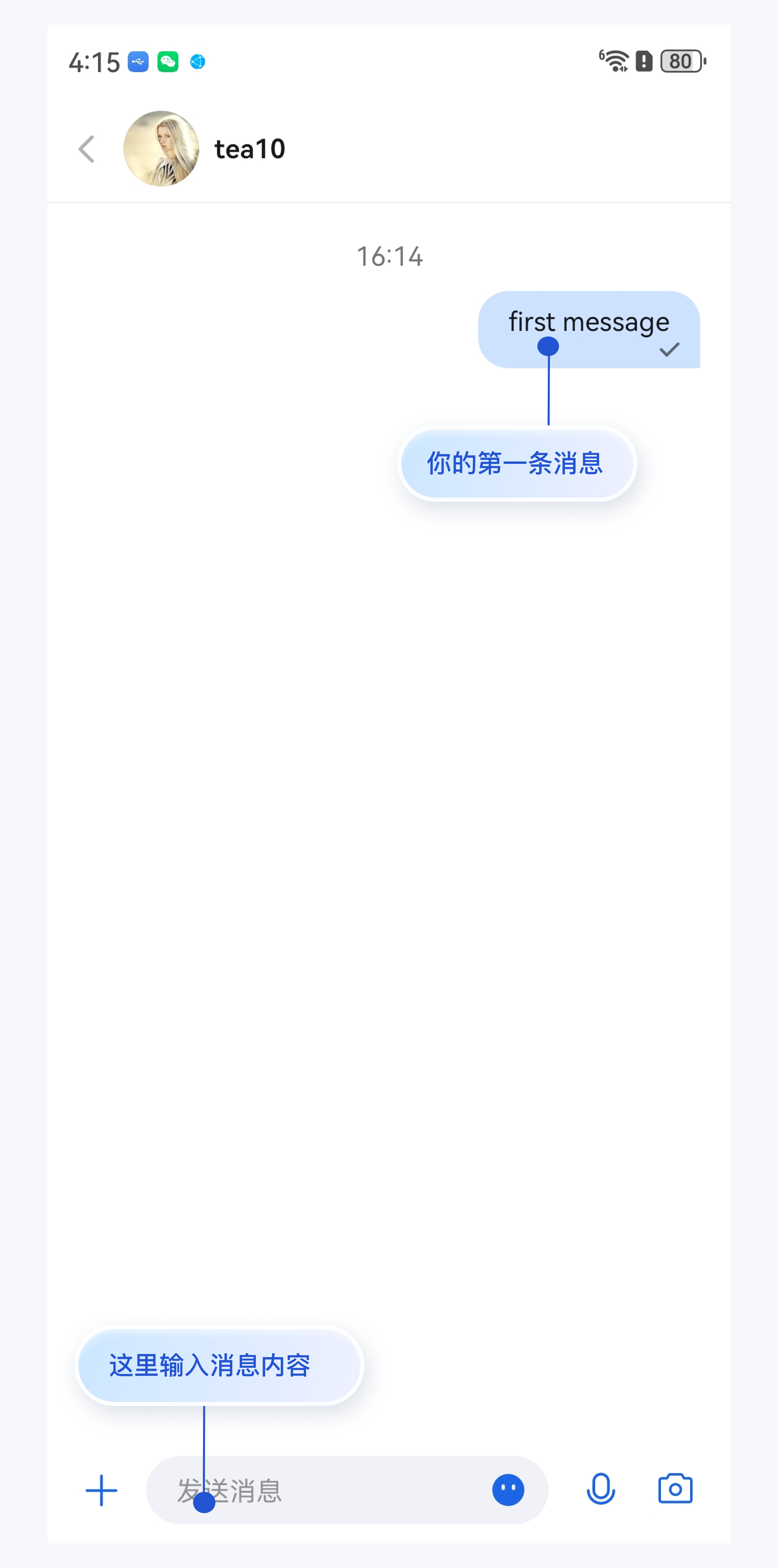 操作完上述步骤,您可以跳转到如下的聊天界面。快点手动点击输入框,发送您的第一条消息吧: