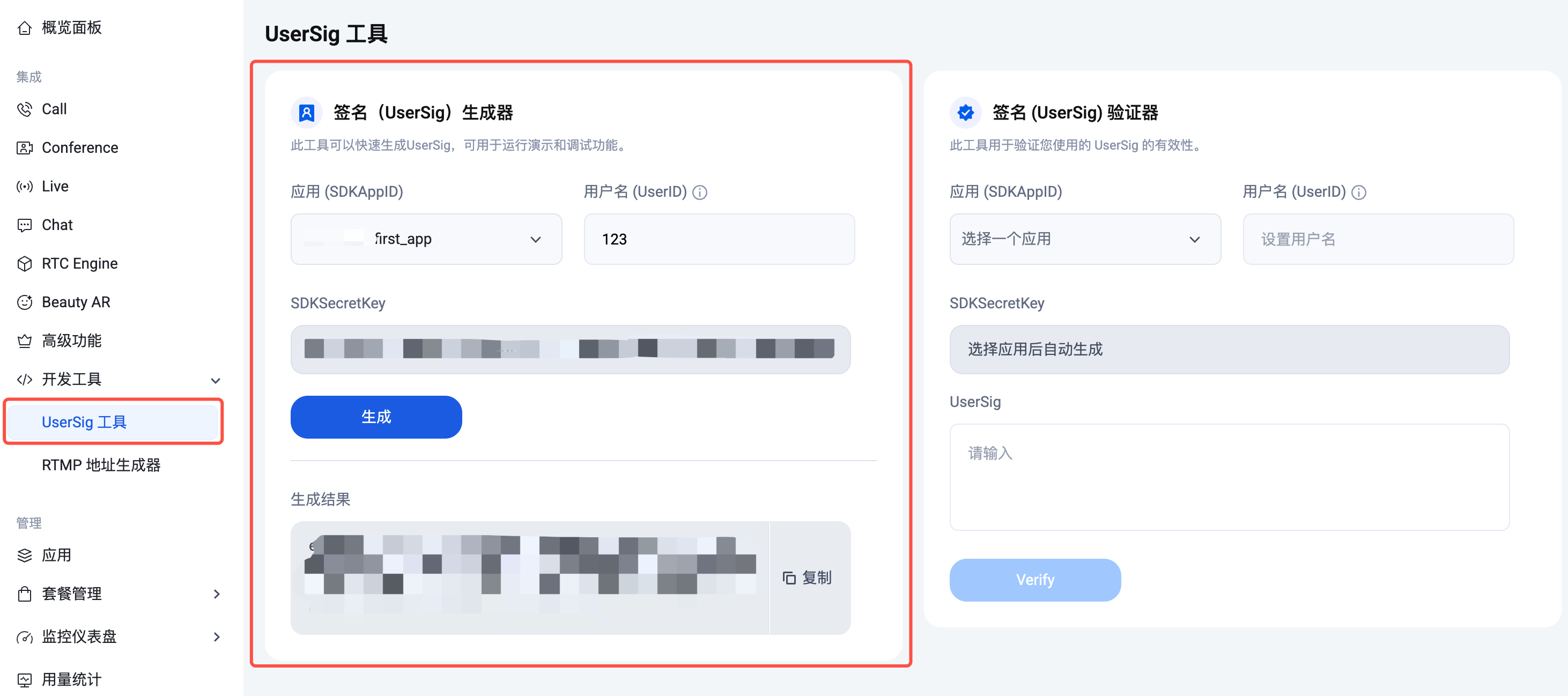 2. 在签名(UserSig)生成工具区域,选择应用,输入 UserID。