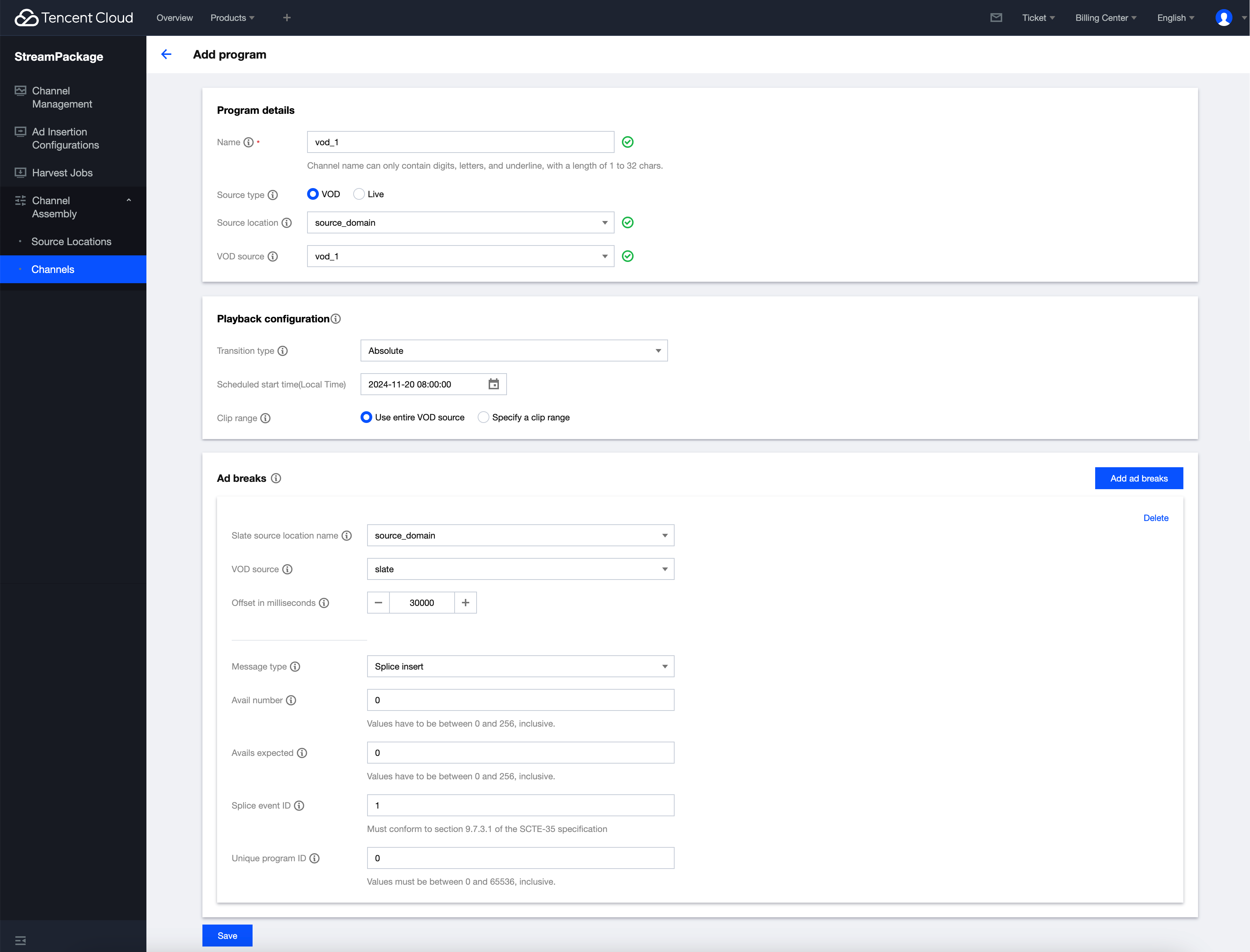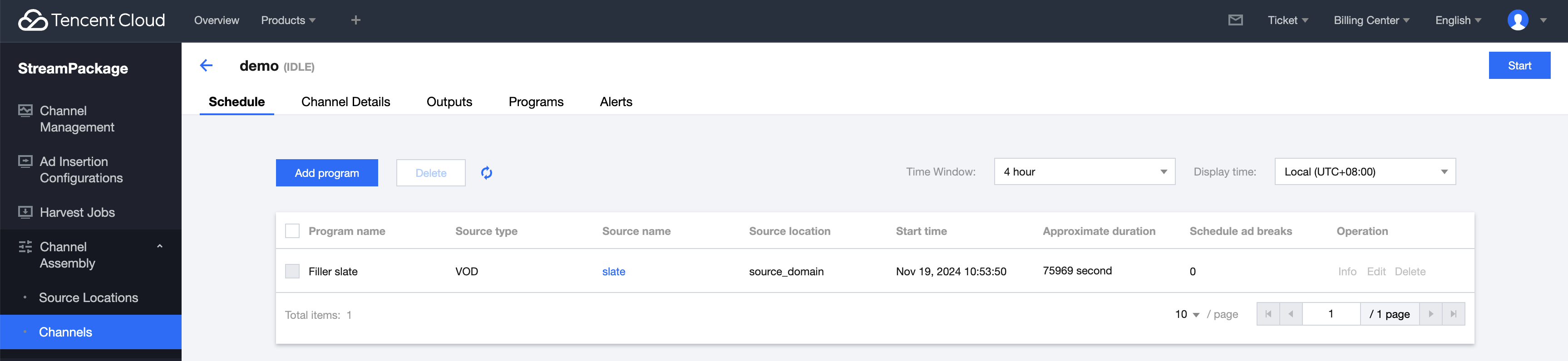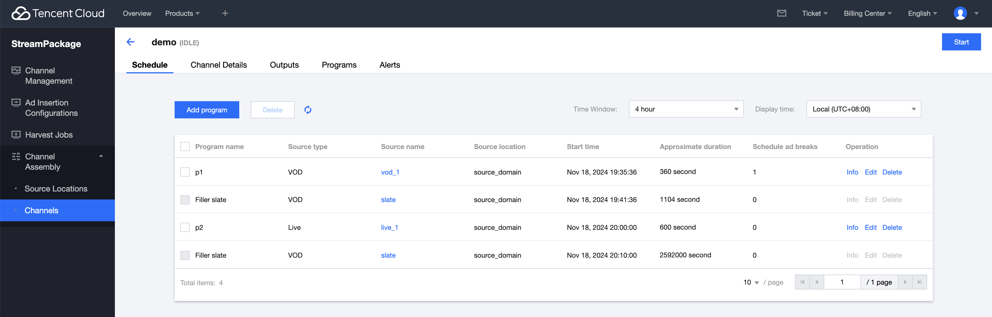 创建完成后,查看频道 Schedule 列表,可以看到完整的节目表和开始时间,预估的时长等信息。