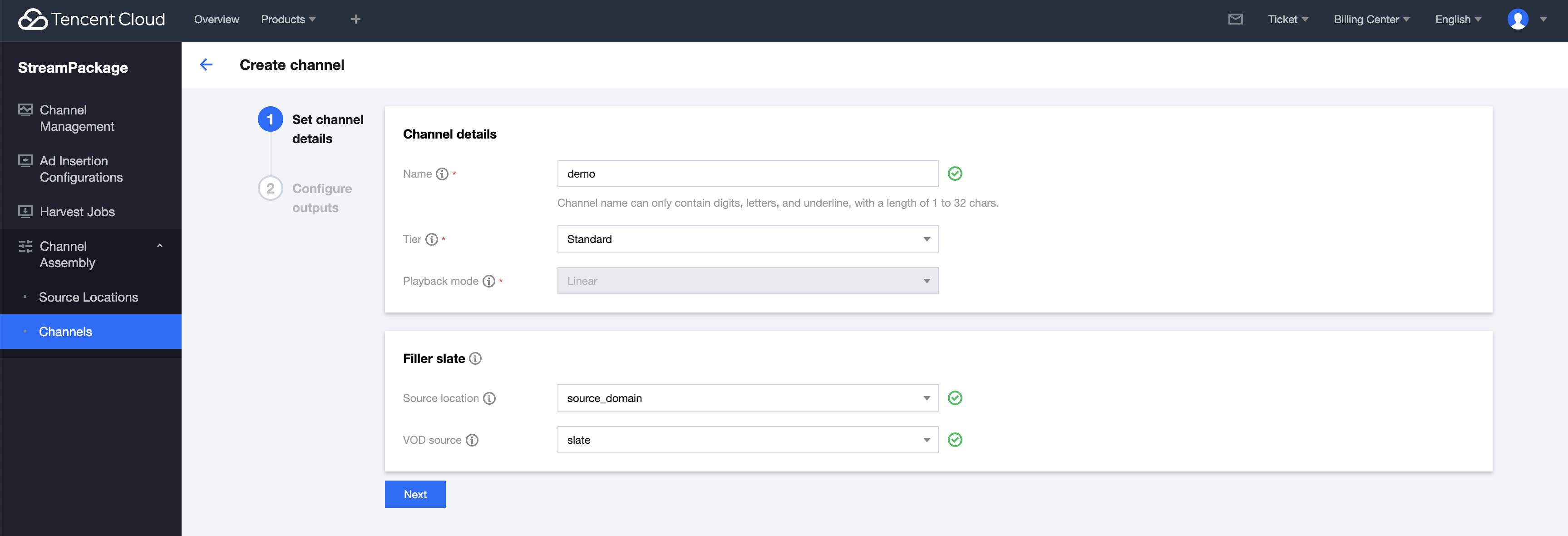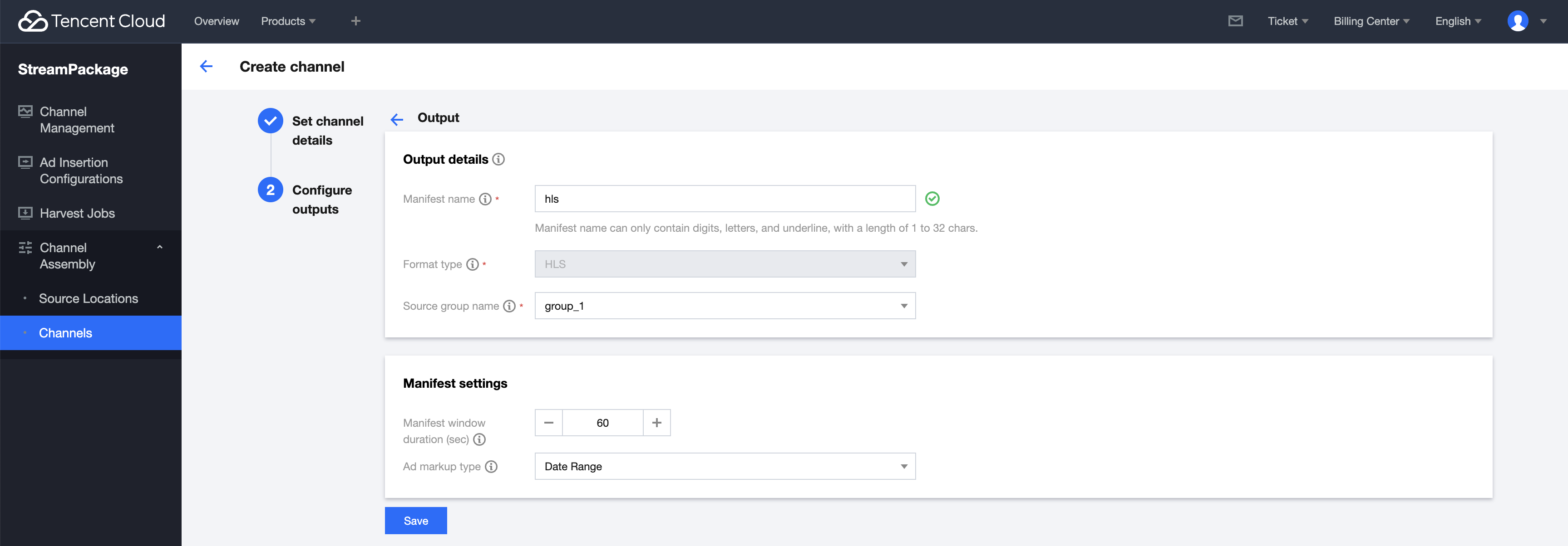 1. 通过左边栏进入 Channels 页面,再单击 Create 创建频道。输入频道信息,这里选择了 Standard 类型的频道,支持 VOD 和 Live,单击 Next。 2. 按照页面提示,根据您的需求,配置 Output details 和 Manifest settings。单击 Save 完成频道创建,如下图所示: