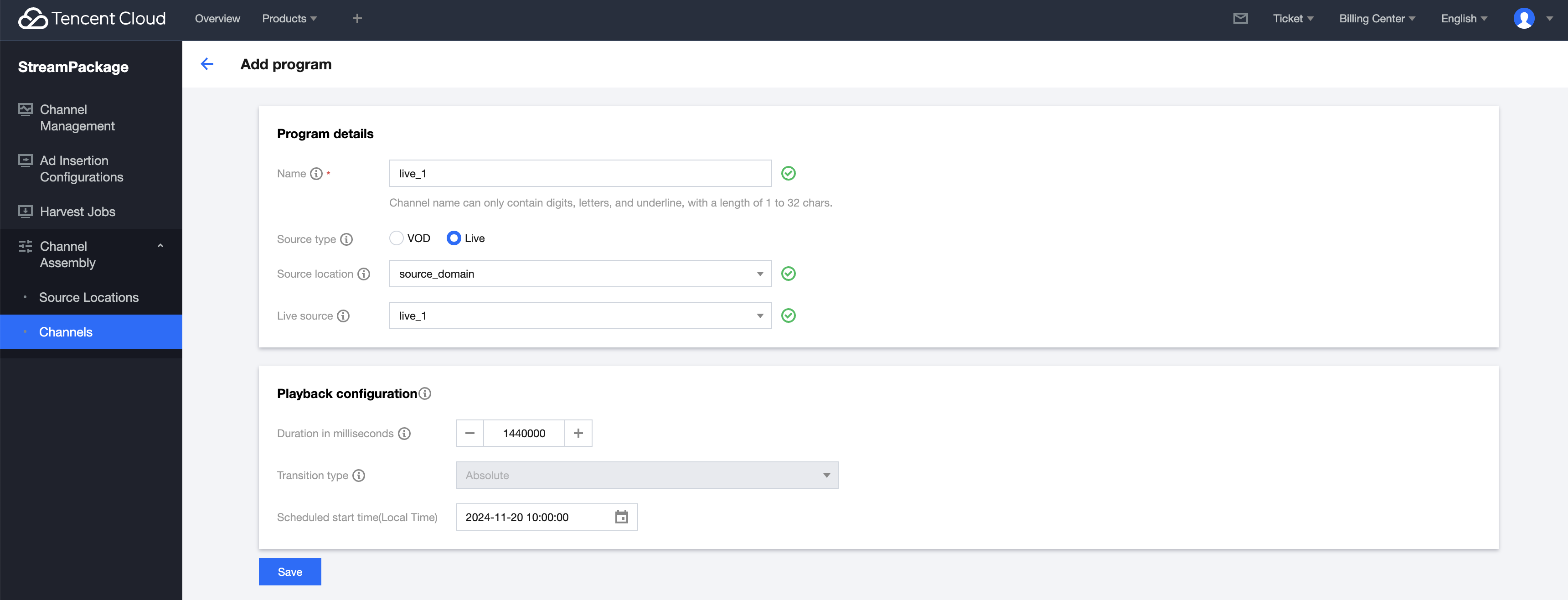 2. 再创建一个 Live 类型的 program。如下图所示。 查看节目播放列表