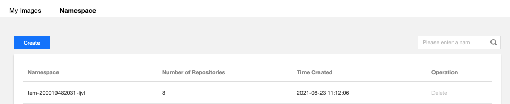 如果您在继续新建应用时选择镜像>自动创建的方式上传程序包,您上传的镜像将被推送至一个 TEM 创建的命名空间。