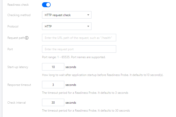 请在应用部署 > 健康检查页面中,检查应用的就绪检查配置是否正确。