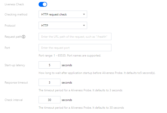 请在应用部署 > 健康检查页面中,检查应用的存活检查配置是否正确。