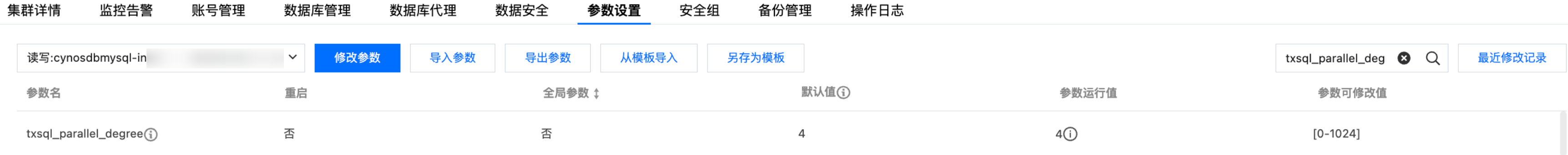 并行度规格限制:txsql_parallel_degree 参数的数值表明单条语句并行查询使用的最大线程数,即并行查询的默认并行度,建议并行度不要超过实例 CPU 核数的二分之一。为保证稳定性,CPU 核数小于4的小规格集群将禁用并行查询功能,您将无法在控制台或使用命令行调整并行查询相关参数。