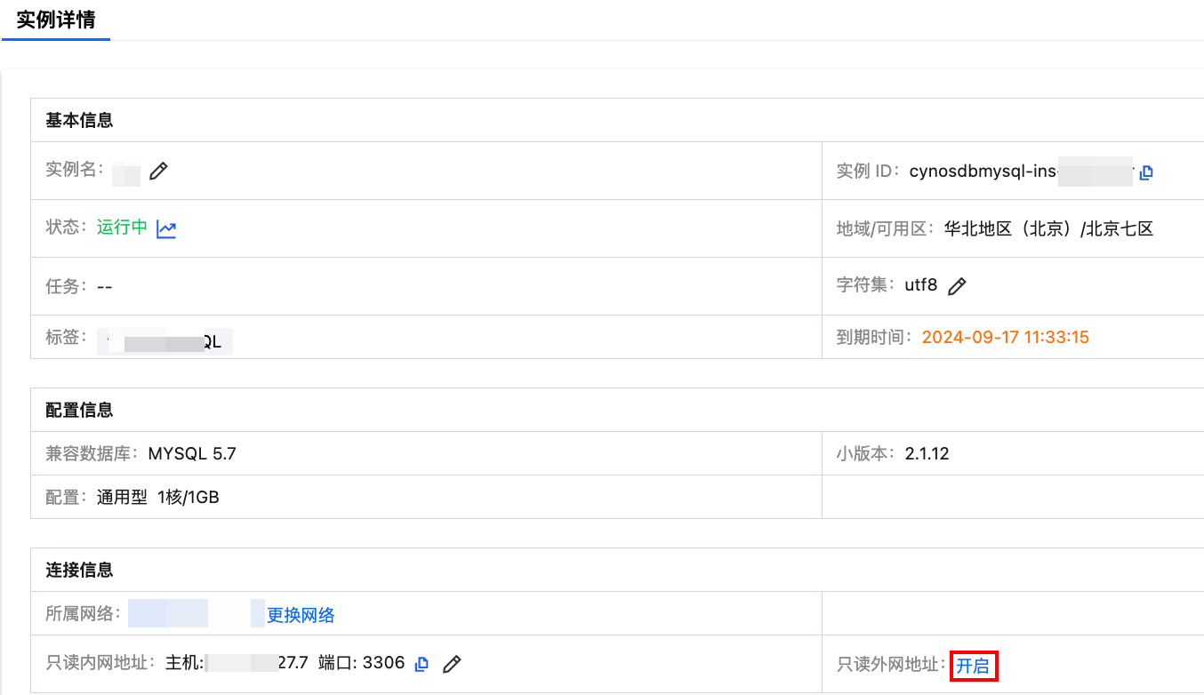 4. 成功开启后,您可在对应实例外网地址处查看外网的主机和端口,外网主机和端口不支持修改。