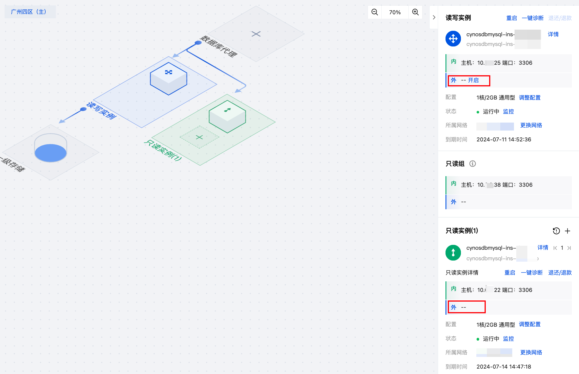 2. 在集群详情下,找到需要开启外网的实例,鼠标移动到读写/只读地址的外网处,会显示开启字样,单击开启。