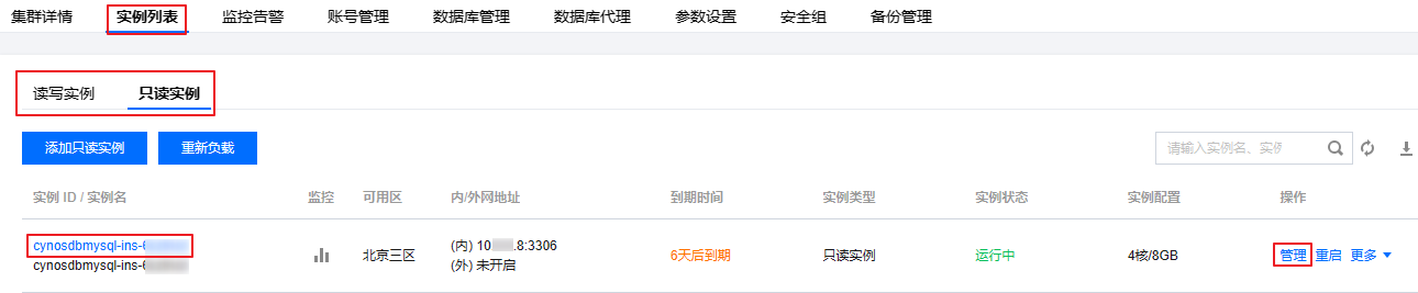 2. 在集群管理页 > 实例列表页,选择需要开启外网的实例(读写实例或只读实例),单击其实例 ID 或操作列的管理进入实例详情页。