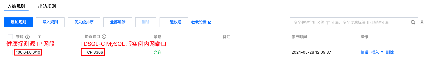 2024年5月中旬开始,CLB 健康探测源 IP 为100.64.0.0/10网段,外网开启后,若您的简约型负载均衡实例健康状态显示为异常,您可在对 TDSQL-C MySQL 版配置安全组时,放通100.64.0.0/10网段,以解决健康检查失败导致负载均衡实例健康状态显示为异常的问题,操作请参考 修改或添加安全组规则。 您需要对上述简约型负载均衡实例配置监控告警,以通过开启外网地址后的指标情况(公网新建连接数、公网连接数、公网出带宽、公网入带宽等)来监测公网连接,操作步骤请参考 设置告警,策略类型选择如下图所示。 支持地域及实例形态