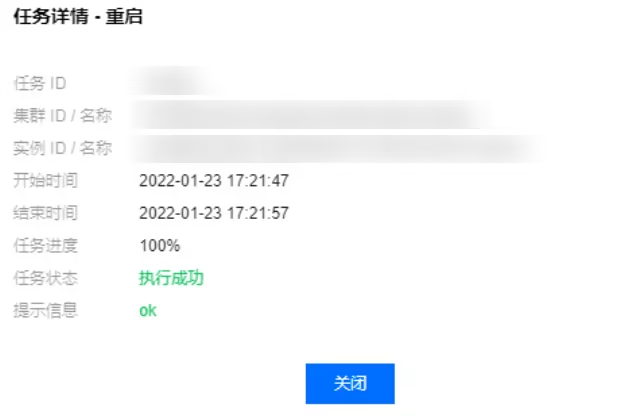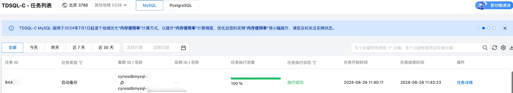 通过任务列表,您可查看的任务类型包括:集群创建、集群回档、实例升降级、参数修改、重启、手动备份、版本升级、新增备可用区、修改备可用区、删除备可用区、切换可用区、修改 binlog 设置、创建数据库代理、数据库代理升级、关闭数据库代理、数据库代理配置连接池、数据库代理节点重新负载、数据库代理内核小版本升级、配置读写分离等。