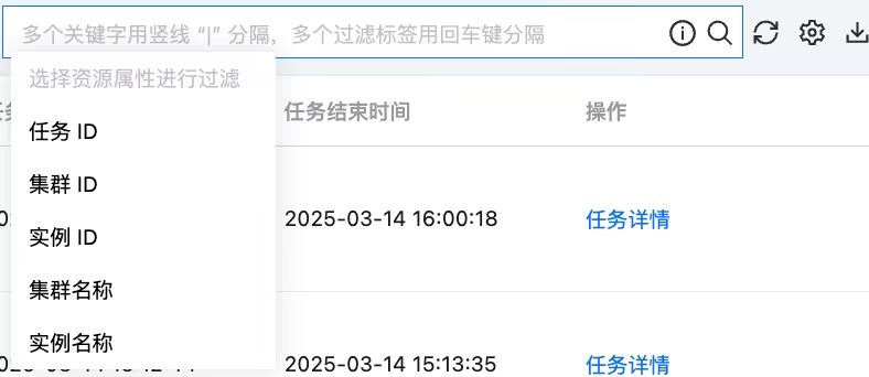 在任务列表,您可以通过搜索框检索关键字快速查找到目标任务,搜索框内支持按照任务 ID、集群 ID、实例 ID、集群名称、实例名称的资源属性来进行搜索,多个关键字用“|”分隔,多个过滤标签用回车键分隔。